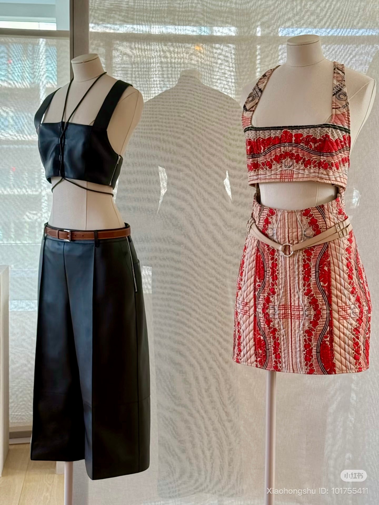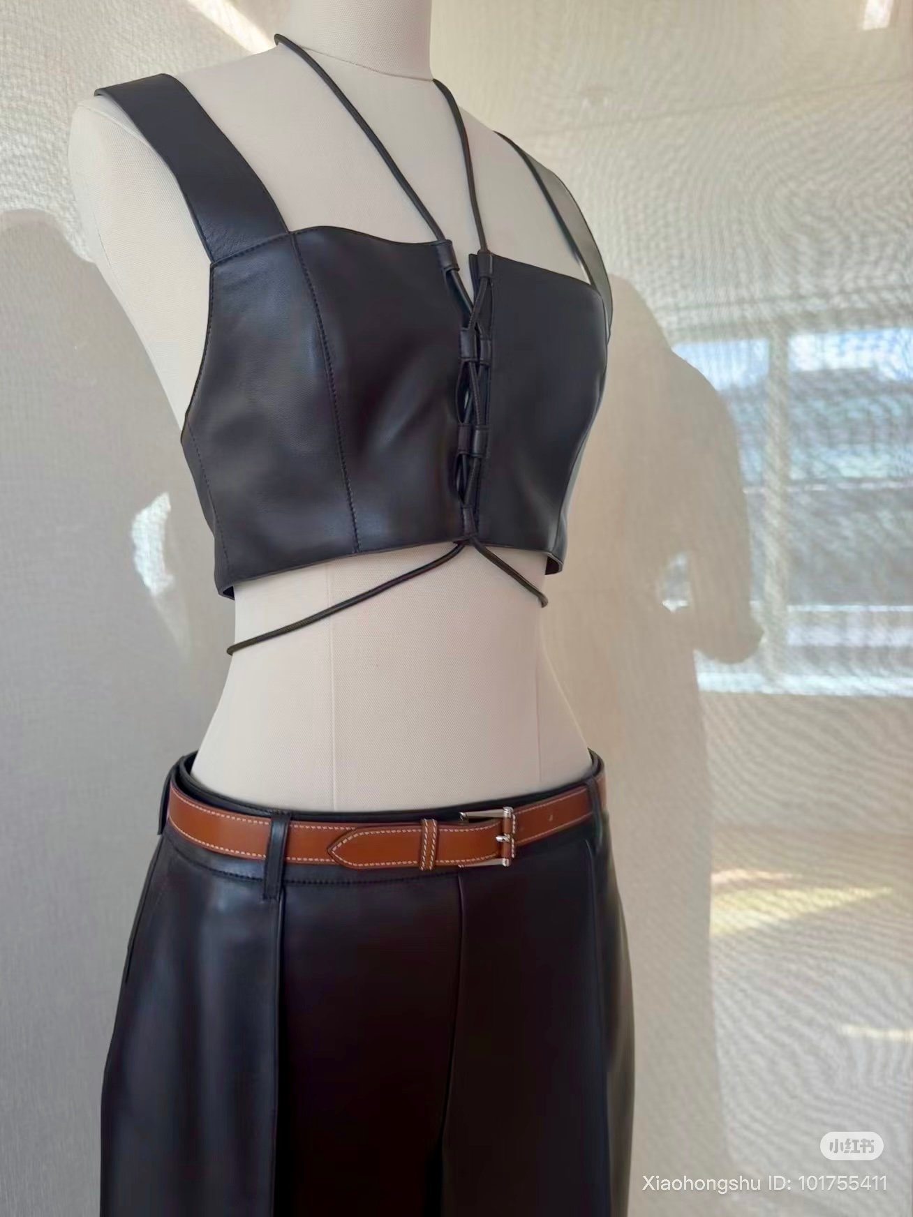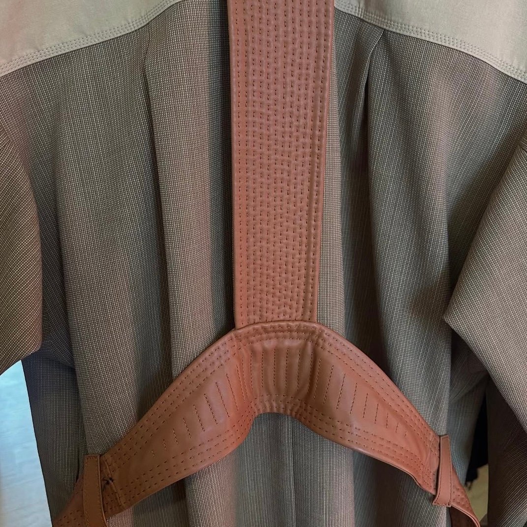Leather harnesses and finely cut geometric patterns traced lines across the body, grounding the collection’s softer, more fluid foundations. The color story was serene yet purposeful, led by warm neutrals—caramel, khaki, creamy beige, crisp white, nude pink, and navy—punctuated with decisive touches of red and blue.