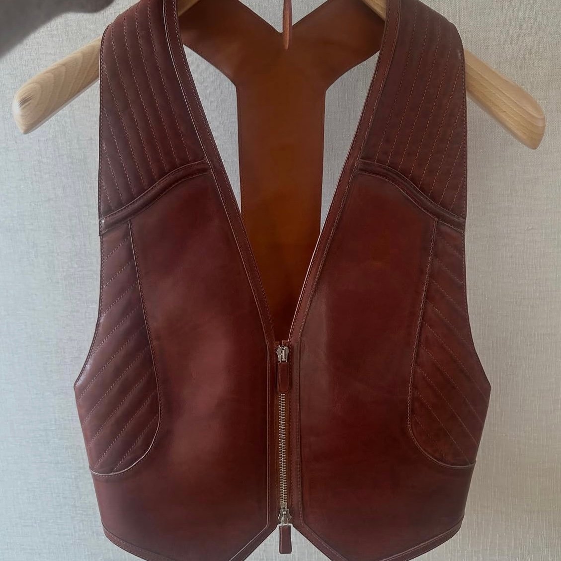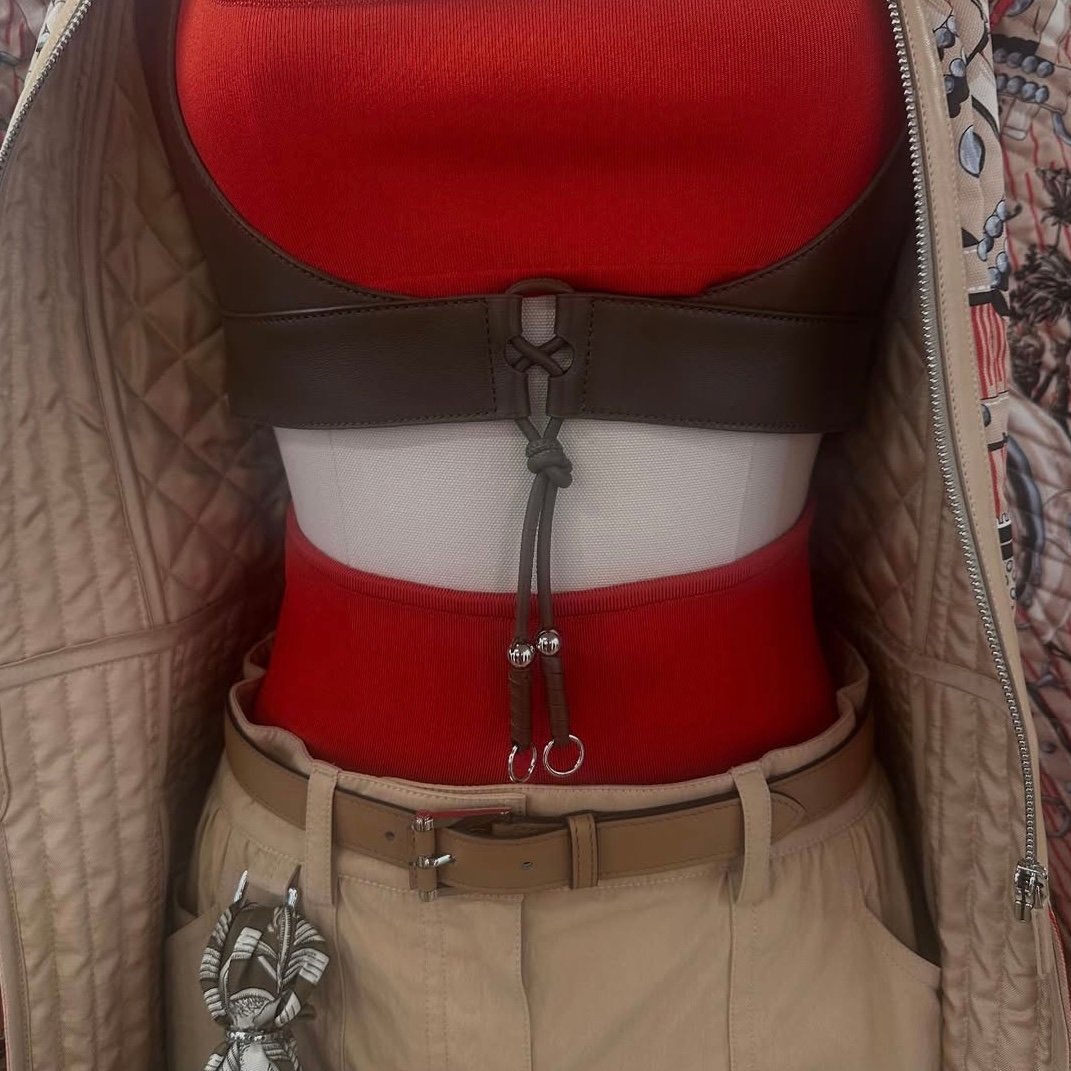 Relaxed tailoring found balance in feminine cut-outs and fluid silhouettes, while intricate leatherwork added the signature Hermès edge. Equestrian cues were ever-present: wrap skirts evoking saddle flaps, subtle quilting reminiscent of saddle pads, and harness-inspired detailing—all grounded with pairs of polished riding boots. The palette was serene yet purposeful, led by neutrals—warm caramel, khaki, creamy beige, crisp white, nude pink, and navy—punctuated with decisive touches of red as summer brights.