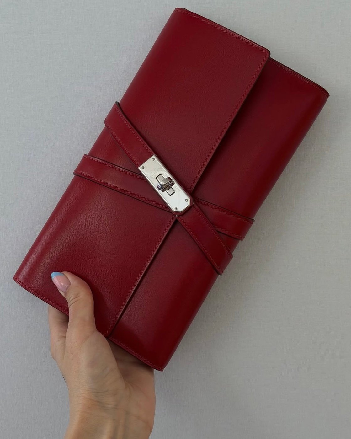 A fresh clutch silhouette emerges this season, crafted from Box calfskin. Clean and minimalist in form, the design is accented with a wraparound belt detail, secured by the iconic Kelly buckle for a refined finishing touch.