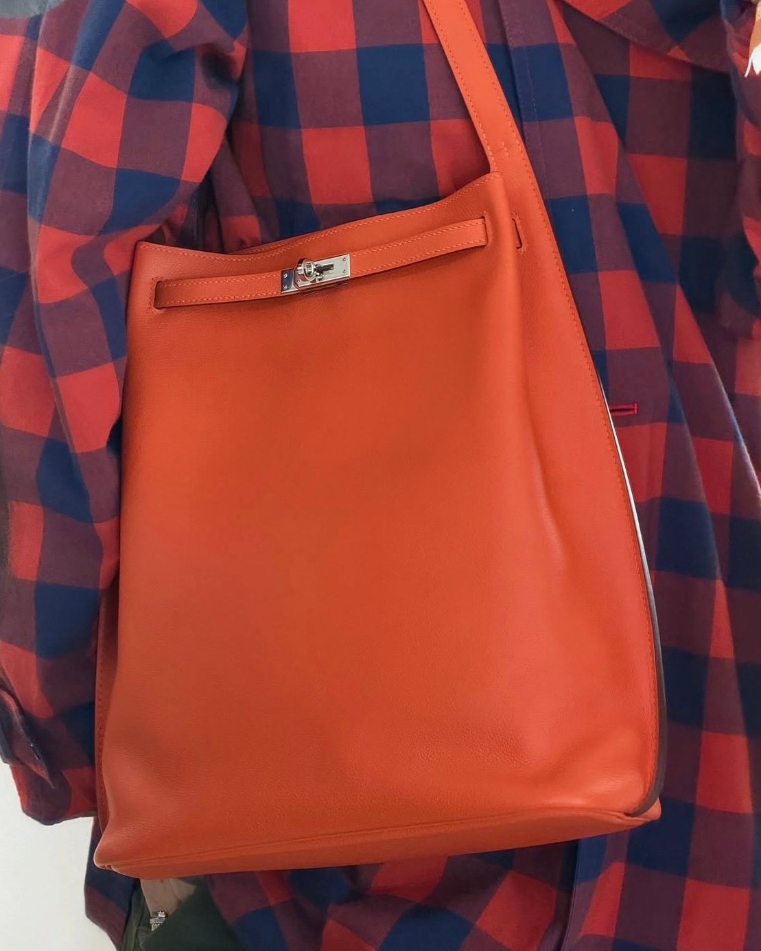 Unlike the original, the adjustable shoulder strap on this fresh iteration extends seamlessly from the body of the bag as a single leather piece, rather than being attached via D-rings. This design update creates a prominent seam along the sides, adding structure and a refined edge to the otherwise slouchy silhouette. Secured with a touret and sangle fastening borrowed from the classic Kelly, the bag was styled casually over the shoulder and carried by hand, bringing a relaxed, modern vibe to the runway.
