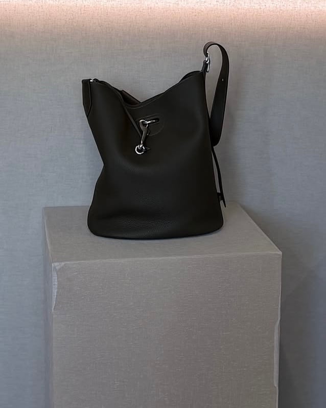 Rounding out the hobo lineup is a new addition that combines slouchy ease with subtle refinement. Roomy and understated, the design fastens with a lobster clasp that hooks onto a metal D-ring extending from the bag’s interior, securing the two layers together with a streamlined, equestrian-inspired touch. Carried by hand on the runway with its adjustable shoulder strap, the bag debuted in two leather constructions: a dual Togo-and-Swift calfskin combination, reminiscent of the Arçon, in black and khaki, and a heritage Box calfskin version in black and chocolate brown.
