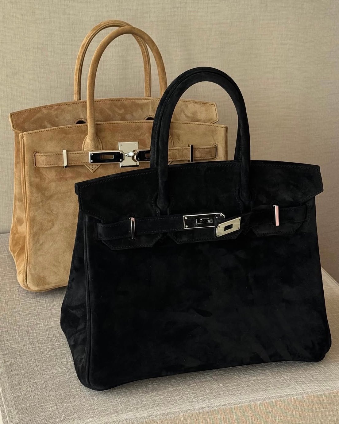 Hermès is bringing us suede for Spring-Summer 2026, and in the most delightful way, as the Birkin in Veau Doblis strutted down the runway several times. Crafted in velvety suede, these distinctive Birkin 30s brought a tactile twist to the collection. Presented in two colorways, the black version was carried by hand, while a second iteration in a Kraft-like shade was tucked under a model’s arm.