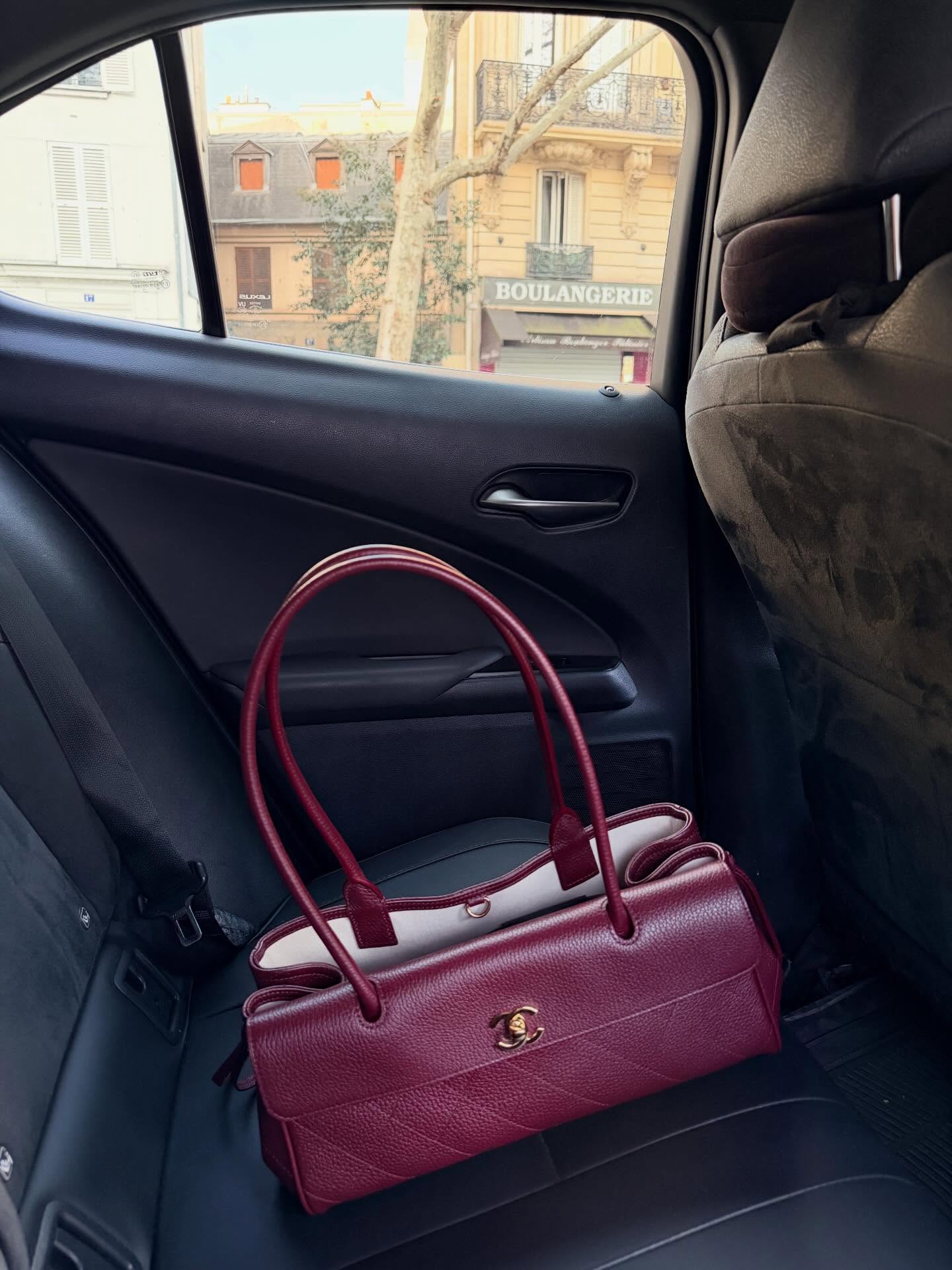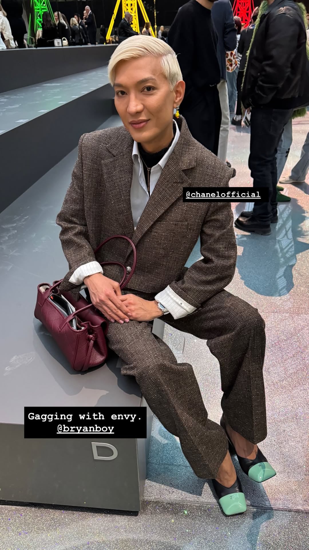Fashion commentator Bryan Yambao arrived with one of Chanel’s newest and most coveted silhouettes  – the Small Tote. Styled in a rich burgundy hue, the bag echoes the design codes of its larger travel-sized sibling, featuring a flat-quilted body, softly cinched sides, and a front flap secured with a classic CC turn-lock.
