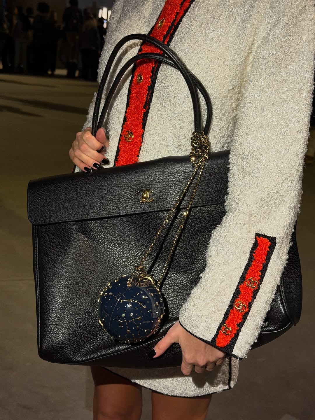 Content creator Alena Mills has been sharing her top picks from the Rue Cambon frenzy since the early drop last week. For the show, she carried one of the most coveted pieces from the Fall–Winter 2026 collection: the Large Shopping Bag in black.
