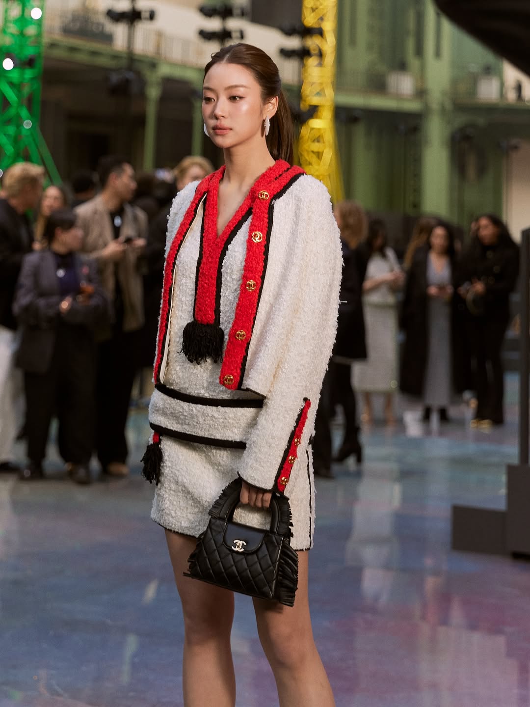 Actress Miu Natsha Taechamongkalapiwat attended her very first Chanel runway show, pairing her Spring–Summer 2026 ready-to-wear look with a matching black bag. Her choice: a fringed version of the top-handle Mini Shopping Bag, affectionately dubbed the Chanel Kelly by collectors.
