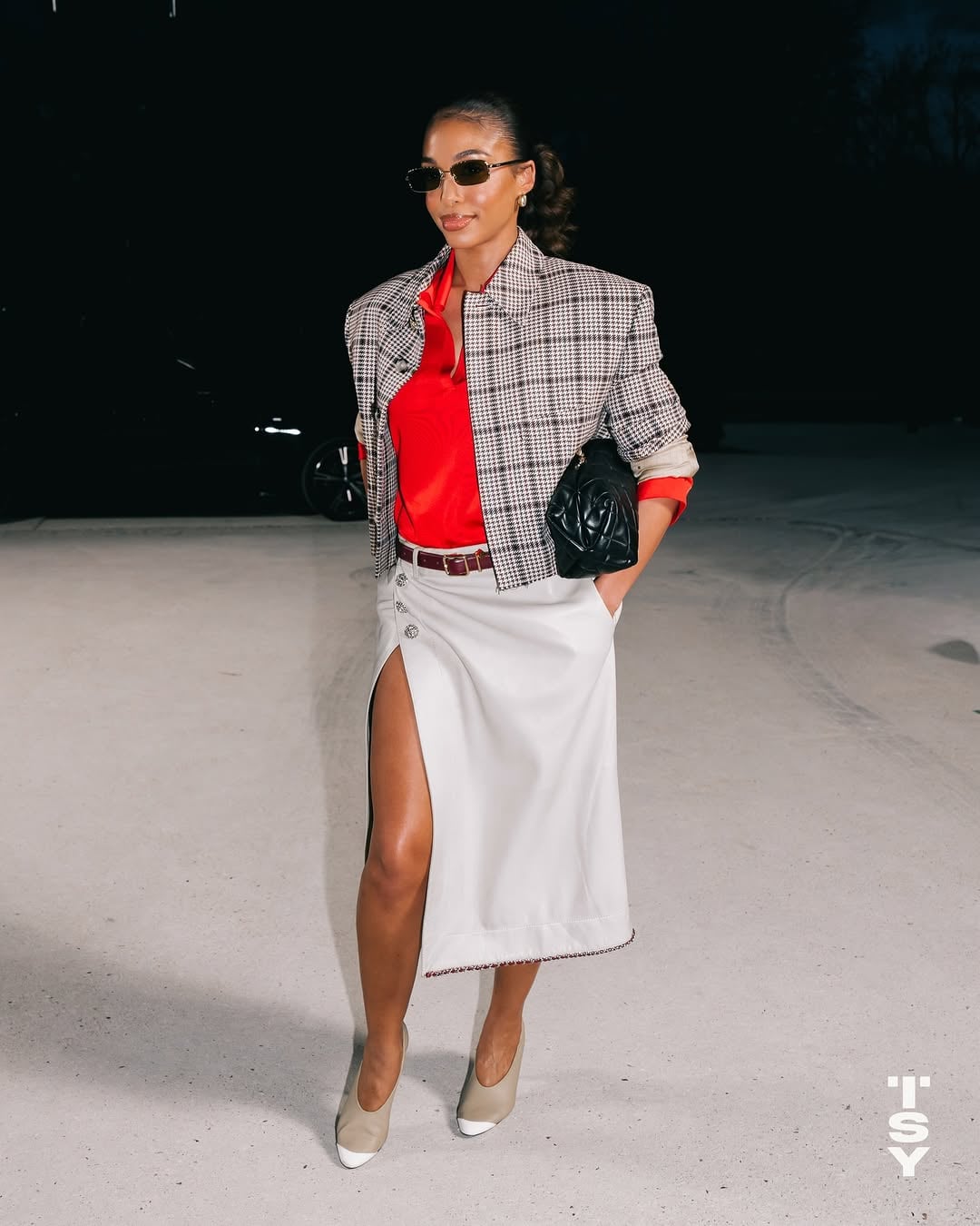 The cuboid silhouette revisits classic quilting, accented with subtle pleated detailing along the sides. A CC emblem completes the streamlined design, keeping the focus on the bag’s silhouette and luxe finish. Harvey tucked the bag under her arm rather than wearing it over the shoulder.
