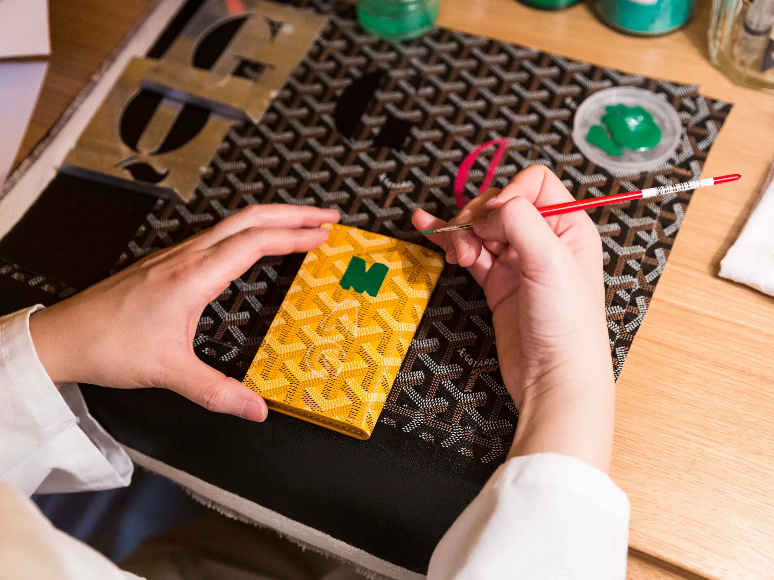 Through the new service, clients can choose their item’s colour from Goyard’s eleven signature shades — think timeless black, rich burgundy, deep green, and more — before adding their own personal touches. Hand-painted initials, stripes, and motifs can be applied in a variety of hues and styles, each finished by Goyard’s artisans. The personalisation process takes around two to three weeks. As every piece is made uniquely for its owner, all personalised items are final sale.