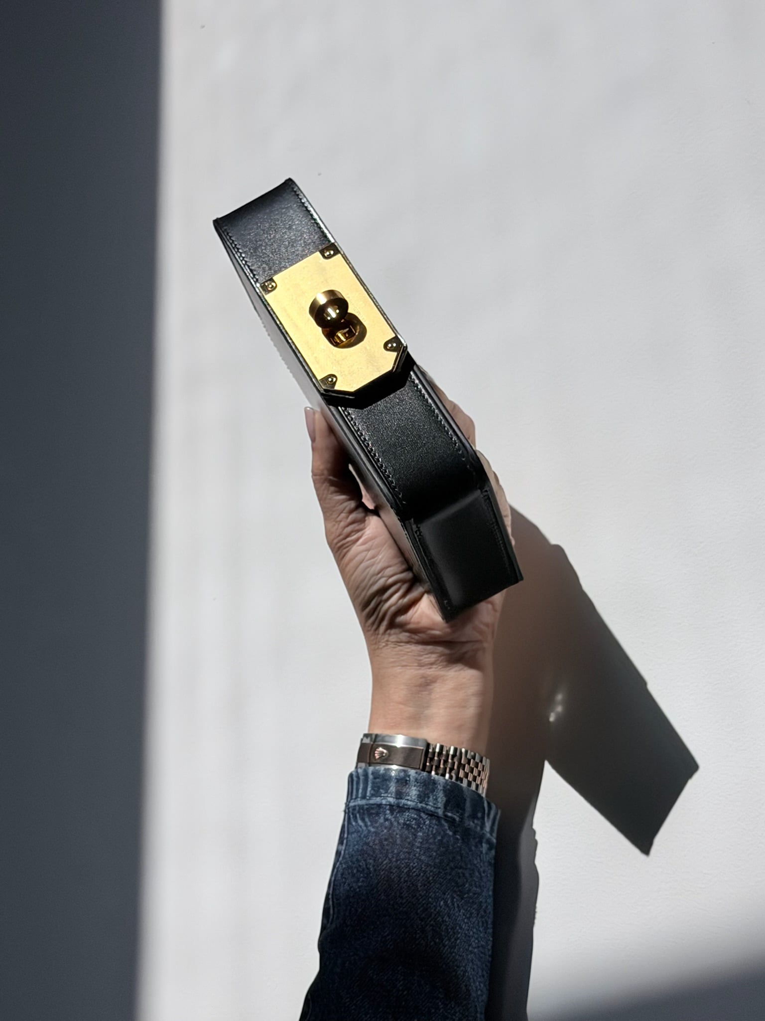 Inspiration begins with its name. Sanglons are the hallmark Hermès closure straps found on every Kelly and Birkin, which seal the bag with a Touret closure. Reimagined here in an oversized format, the straps frame the Sanglons Clutch, meeting at the top with a scaled-up plaque and Touret fastening that mirrors their width. A simple twist of the clasp releases the straps, allowing the box-like form to open with ease.