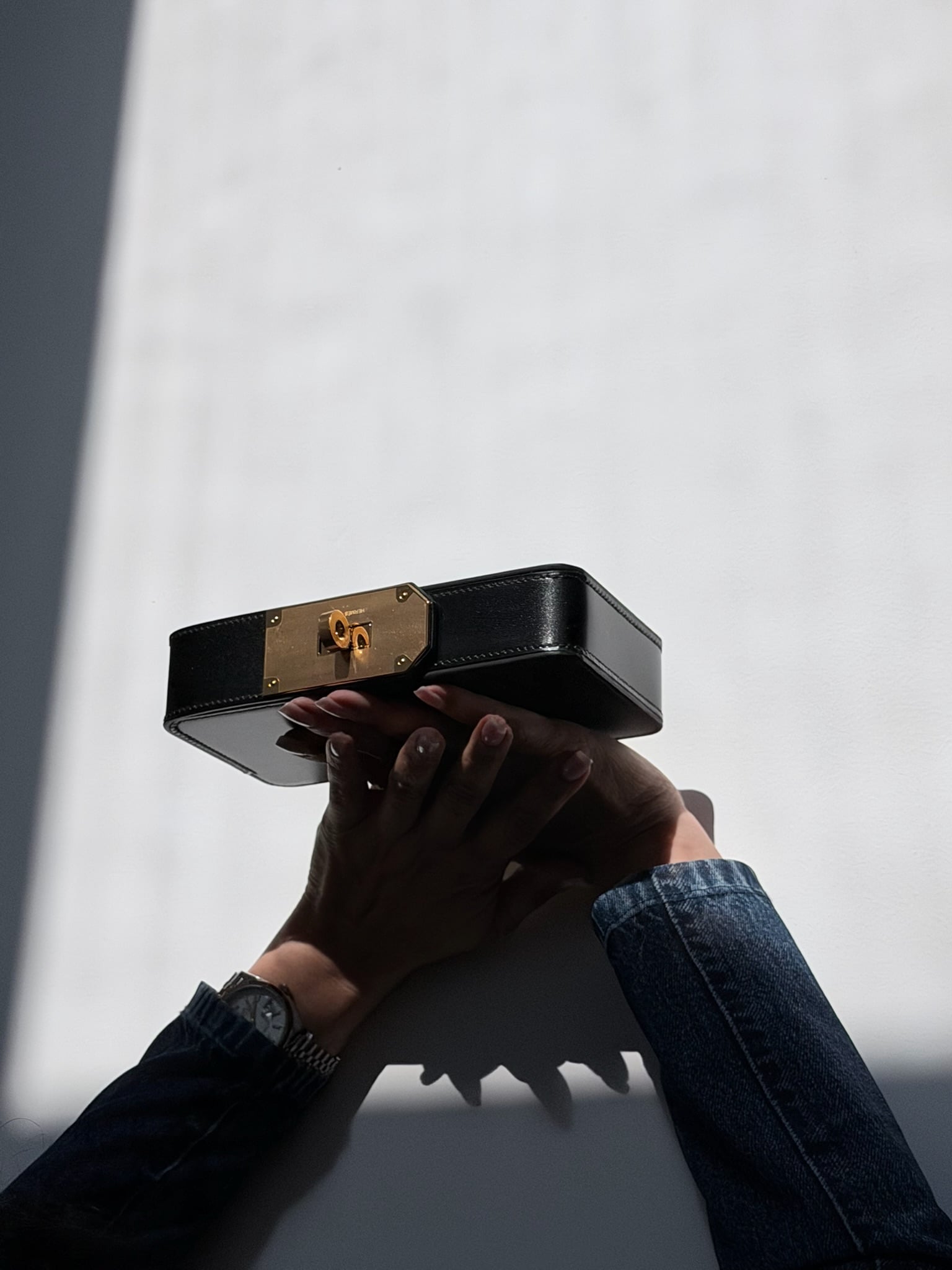 The choice of leather also subtly shifts the feel of the design. In Box calfskin, the clutch takes on a rigid, structured form, reinforcing its hard-shell construction. In Chamkila Chèvre, the finish is more supple, introducing a gentle flexibility that relaxes the silhouette ever so slightly.