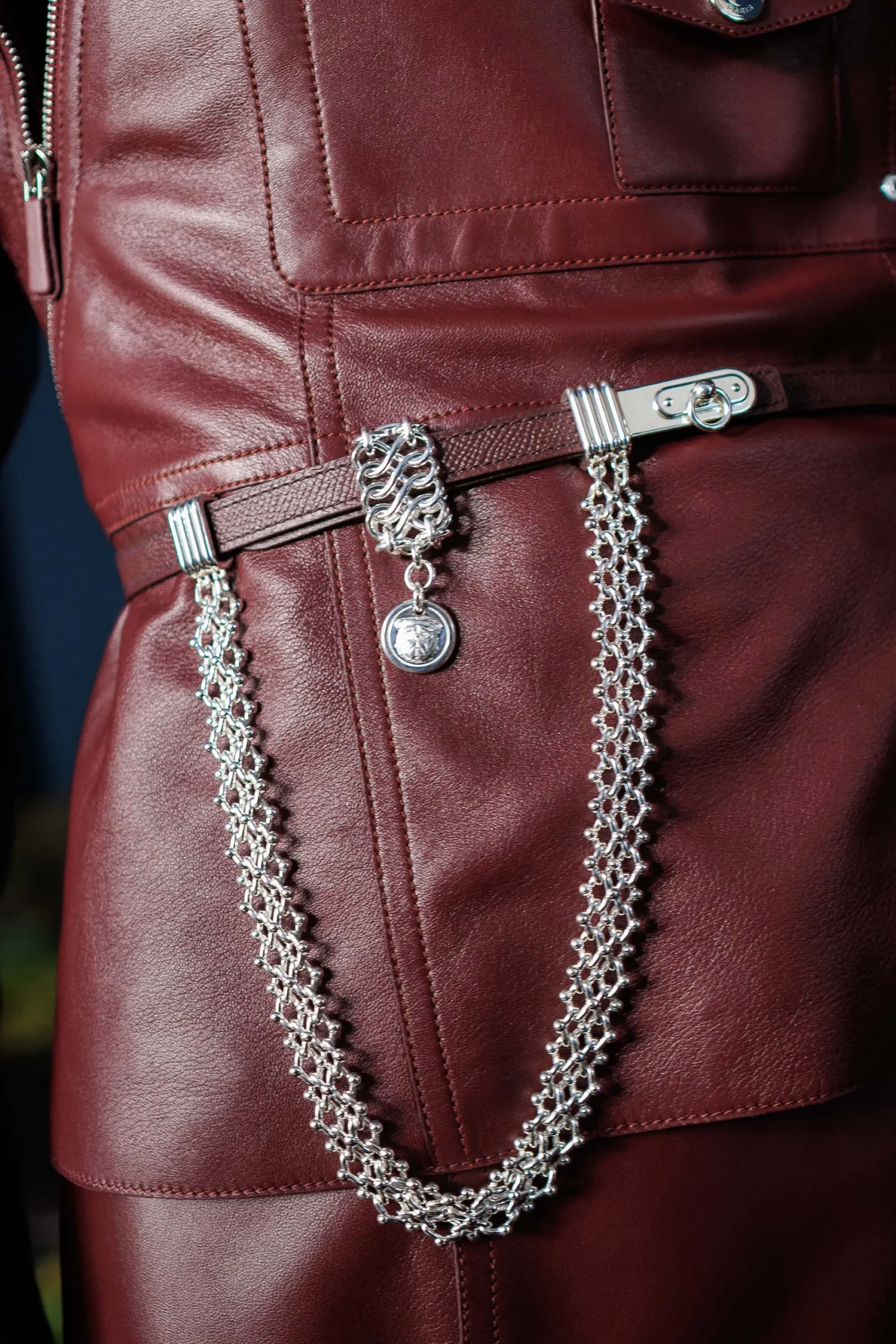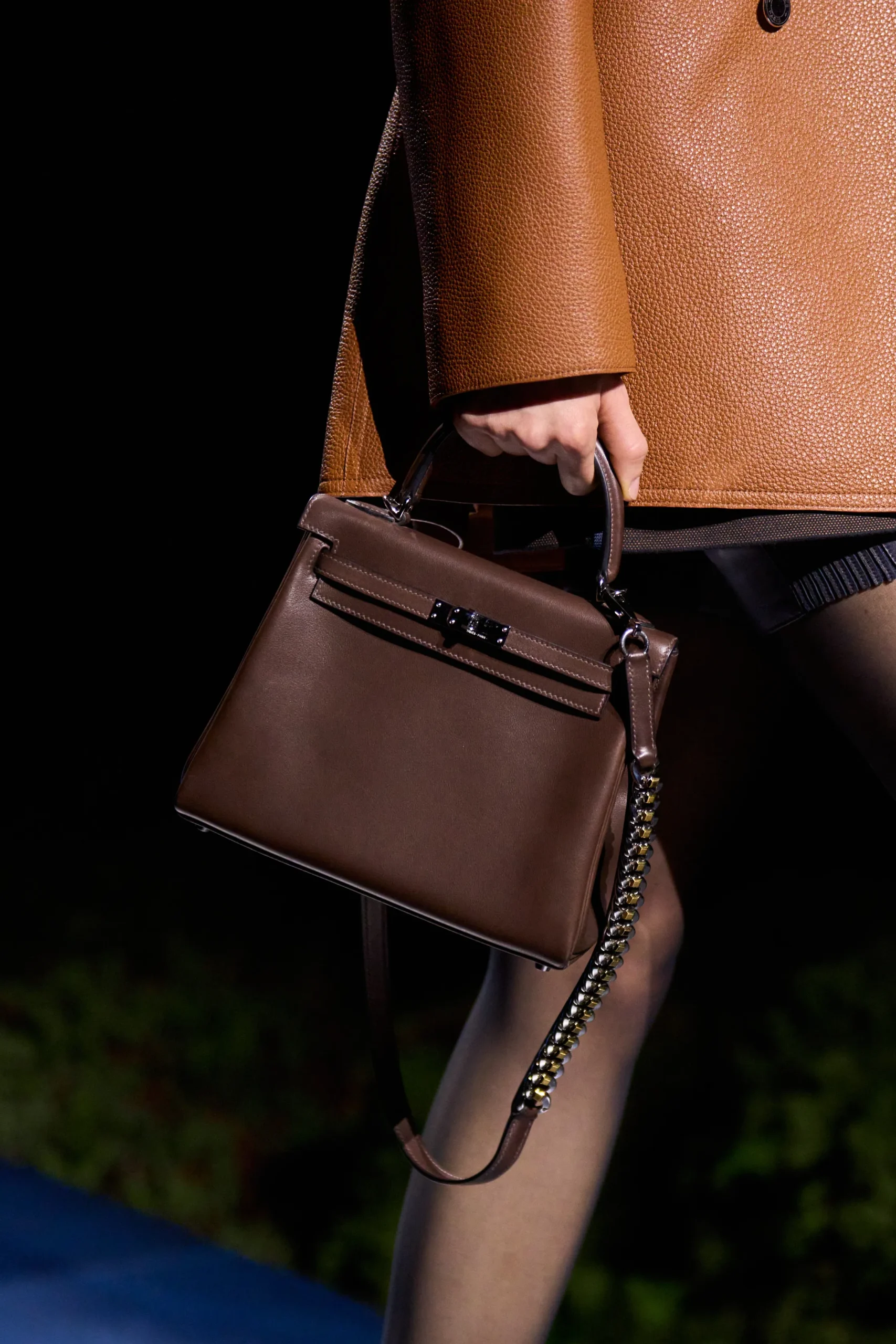 First up, a leather shoulder strap offered a subtle shift in attitude, from ladylike to fierce. Maintaining the standard Kelly strap length but embellished with a chunky palladium chain that matched the bag’s hardware.