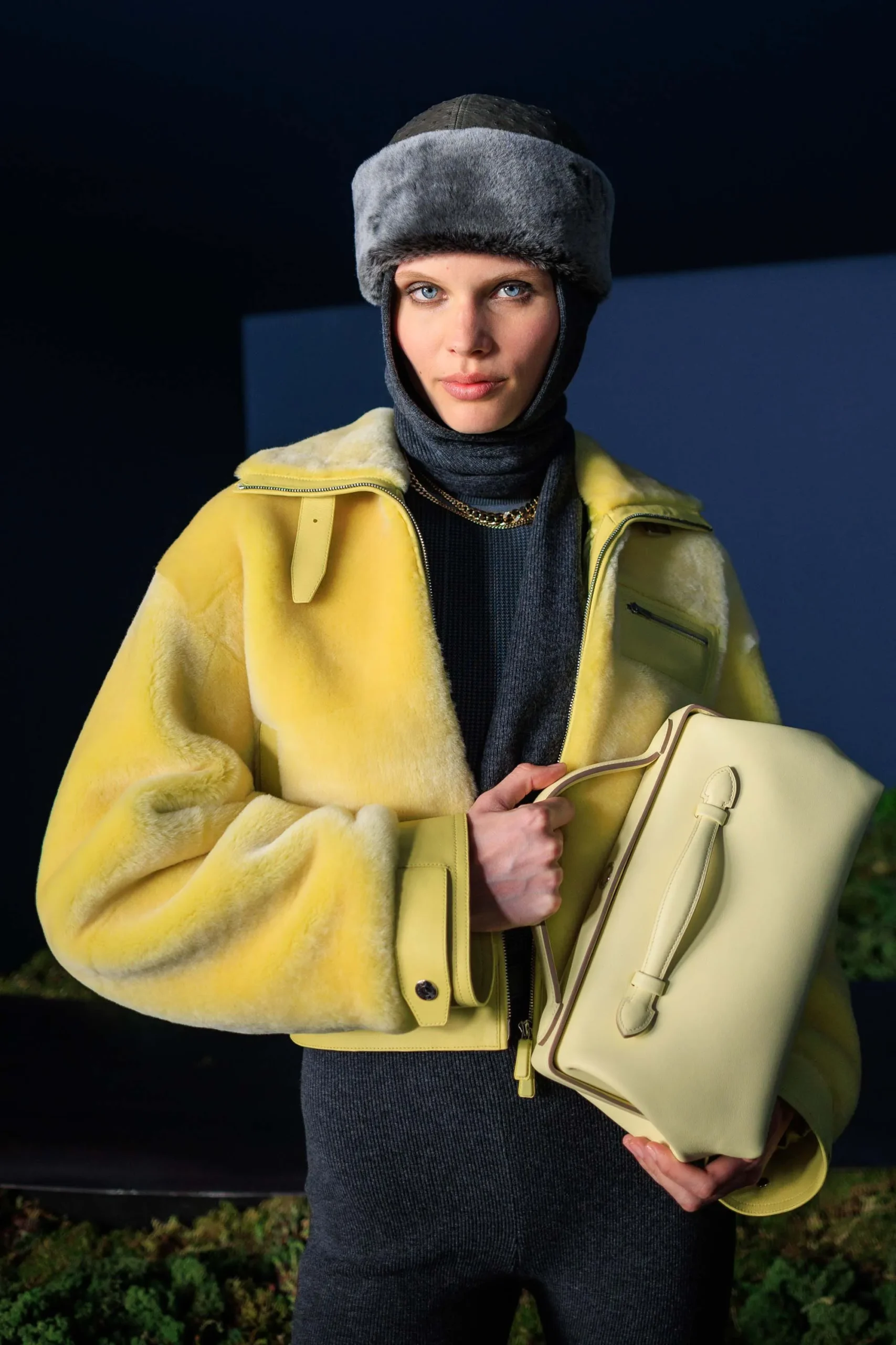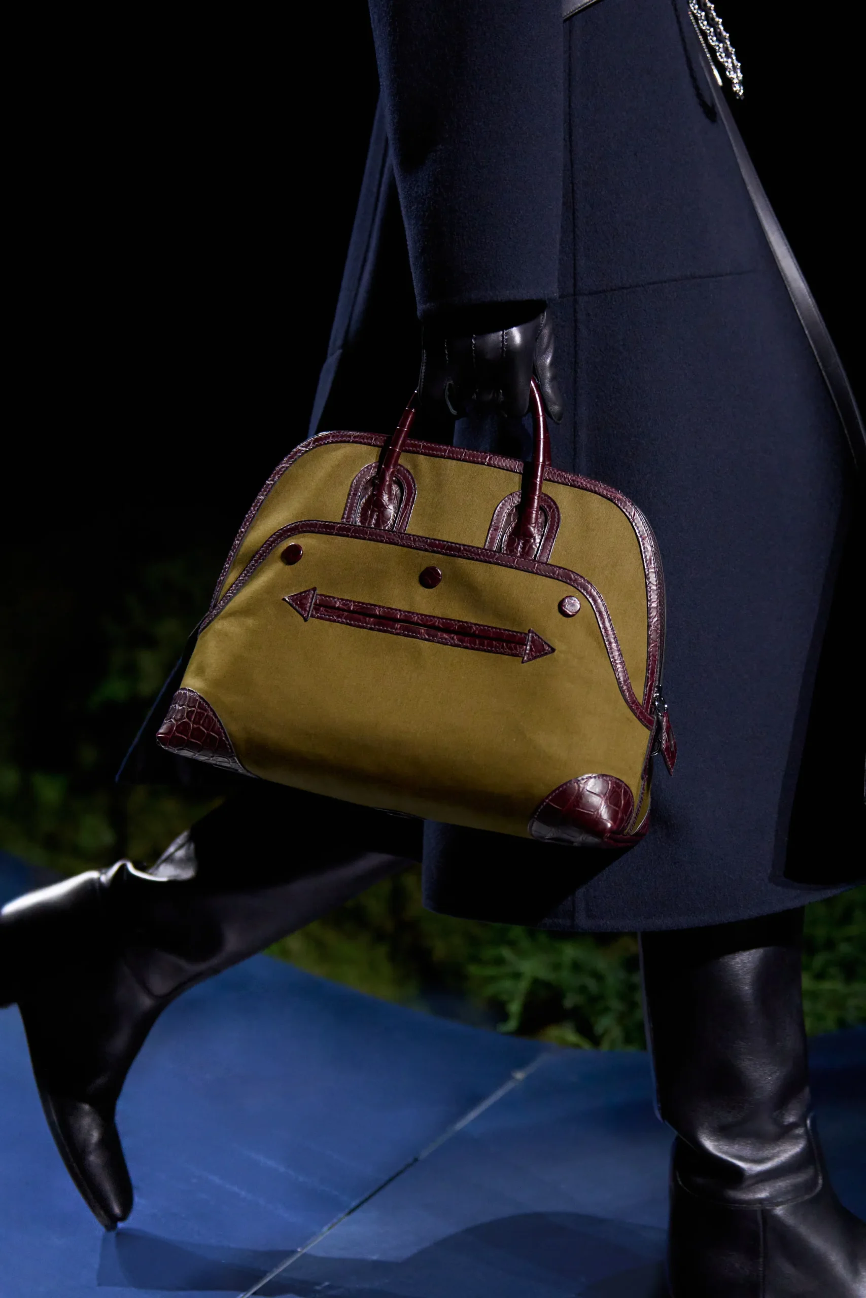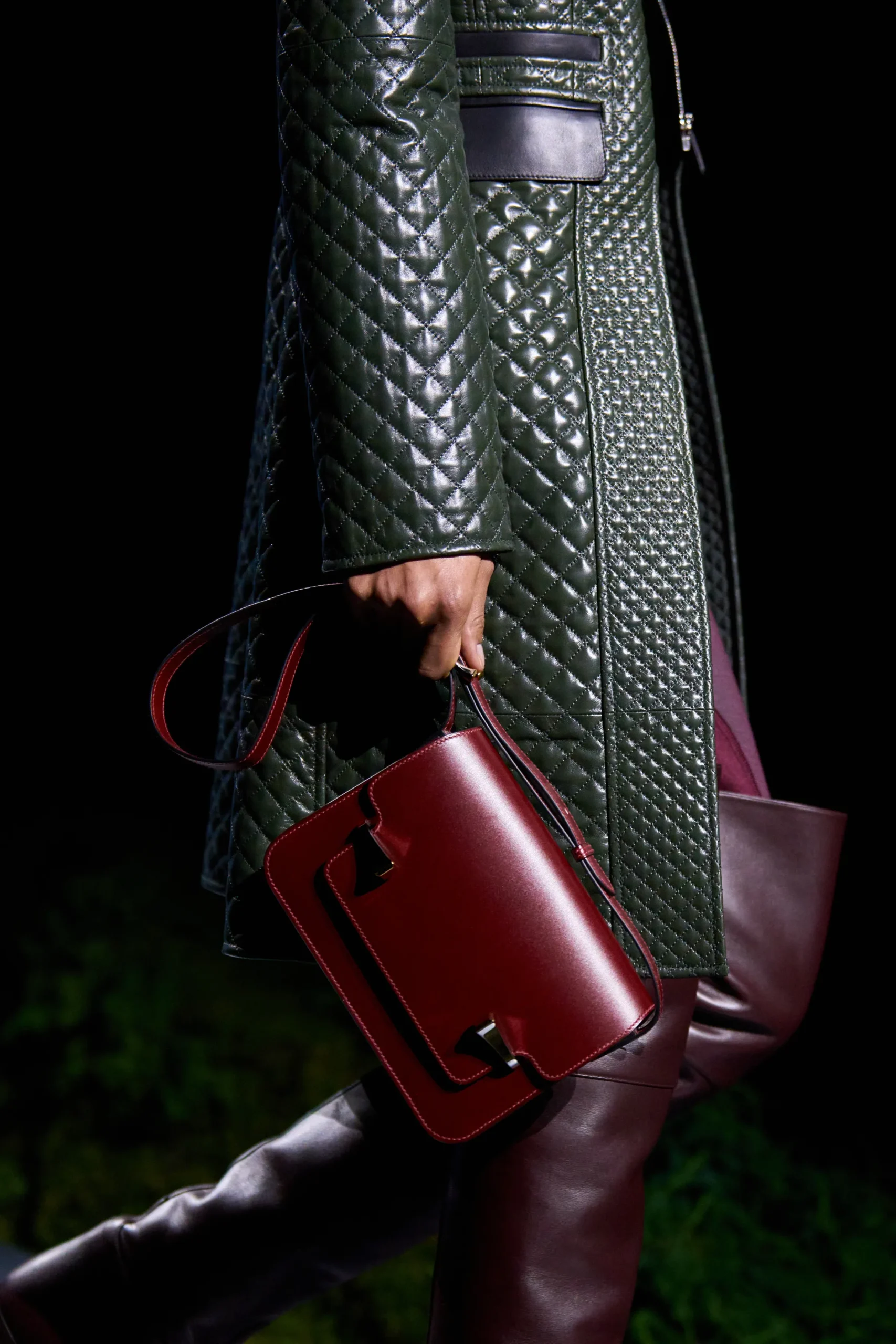 A refined, tonal palette defined the runway, with black, rich ochre, burgundy, and gray leading the way, punctuated by touches of color. Hermès framed the season as one where “night resists reduction to black,” its shades moving from the warmth of sunset to colder, moonlit tones that heighten texture and illuminate surfaces. Throughout the collection, leather caught the light while wool fabrics subtly shifted, with sulphur yellow and oxblood red vibrating against the darker base.