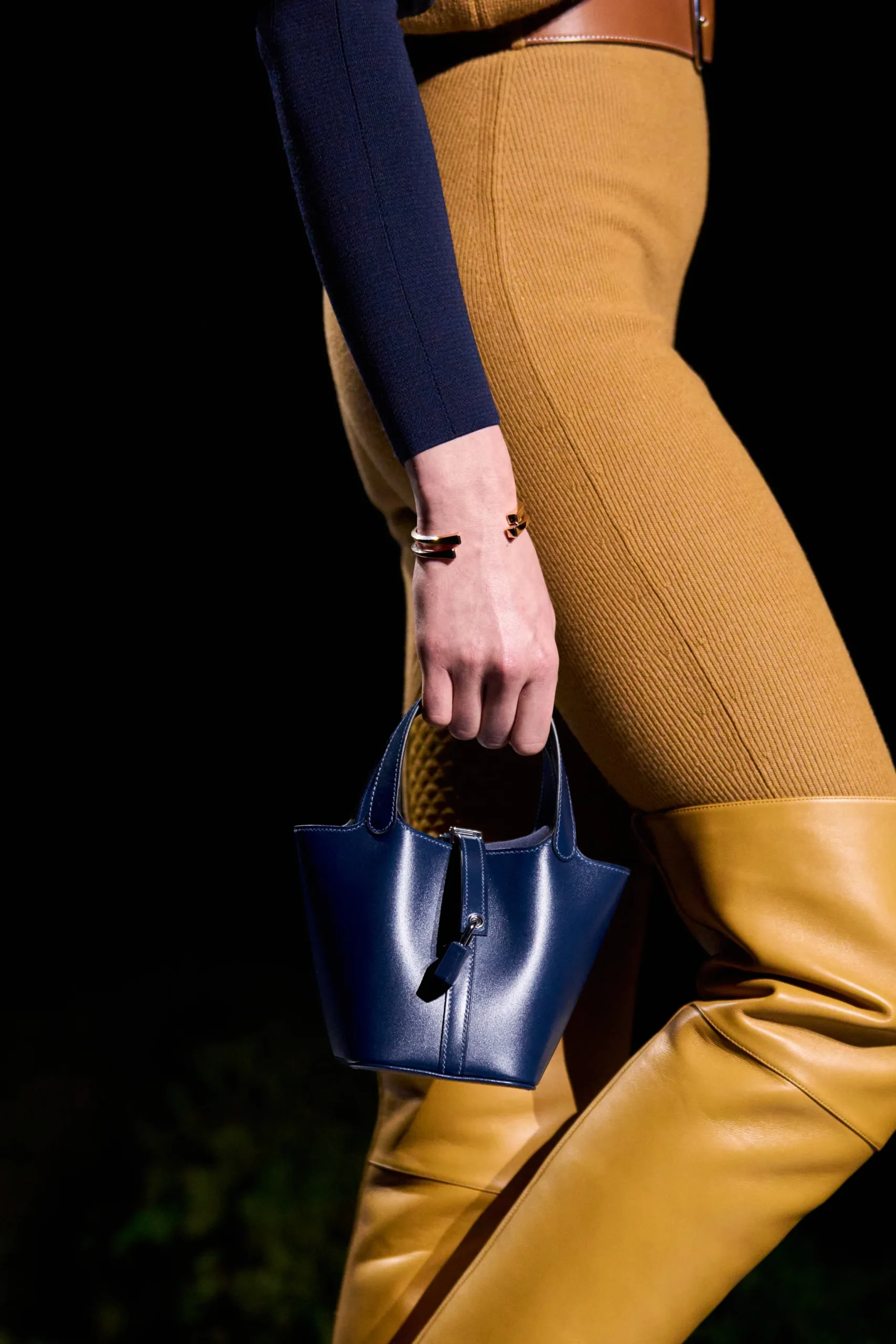 First teased in the pre-show video, the Picotin walked the runway in the petite size 14, affectionately known as the Micro. For the first time, Hermès rendered this familiar silhouette in polished Box calfskin, giving the petite design a structured presence. Even the signature ‘H’ padlock was wrapped in matching box calfskin, echoing the Maison’s leather-clad padlocks seen on exotic Picotin variations, and styled complete with its key. The Micro Picotin 14 appeared in a deep navy hue, Rouge Sellier, and black, all paired with palladium hardware.