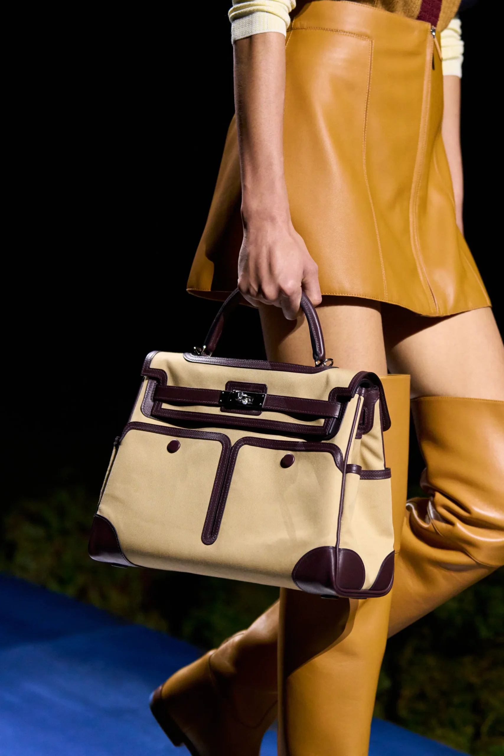 What appeared to be a Kelly Cargo was actually a protective cover for the bag, reminiscent of the cover recently showcased on the Plume in Hermès’ Men’s Fall–Winter 2026 lineup. Crafted from what looks like military canvas, the cover slips over the Kelly, allowing the top handle to thread through while the sangles secure as usual, giving the bag a utilitarian vibe. Front, side, and back pockets provide practical storage, fastening with press studs, while reinforced corners and trim in leather or matte alligator add durability. Showcased across sizes from 25 to 32, the cover’s leather trims matched the bag underneath, creating a cohesive look.
