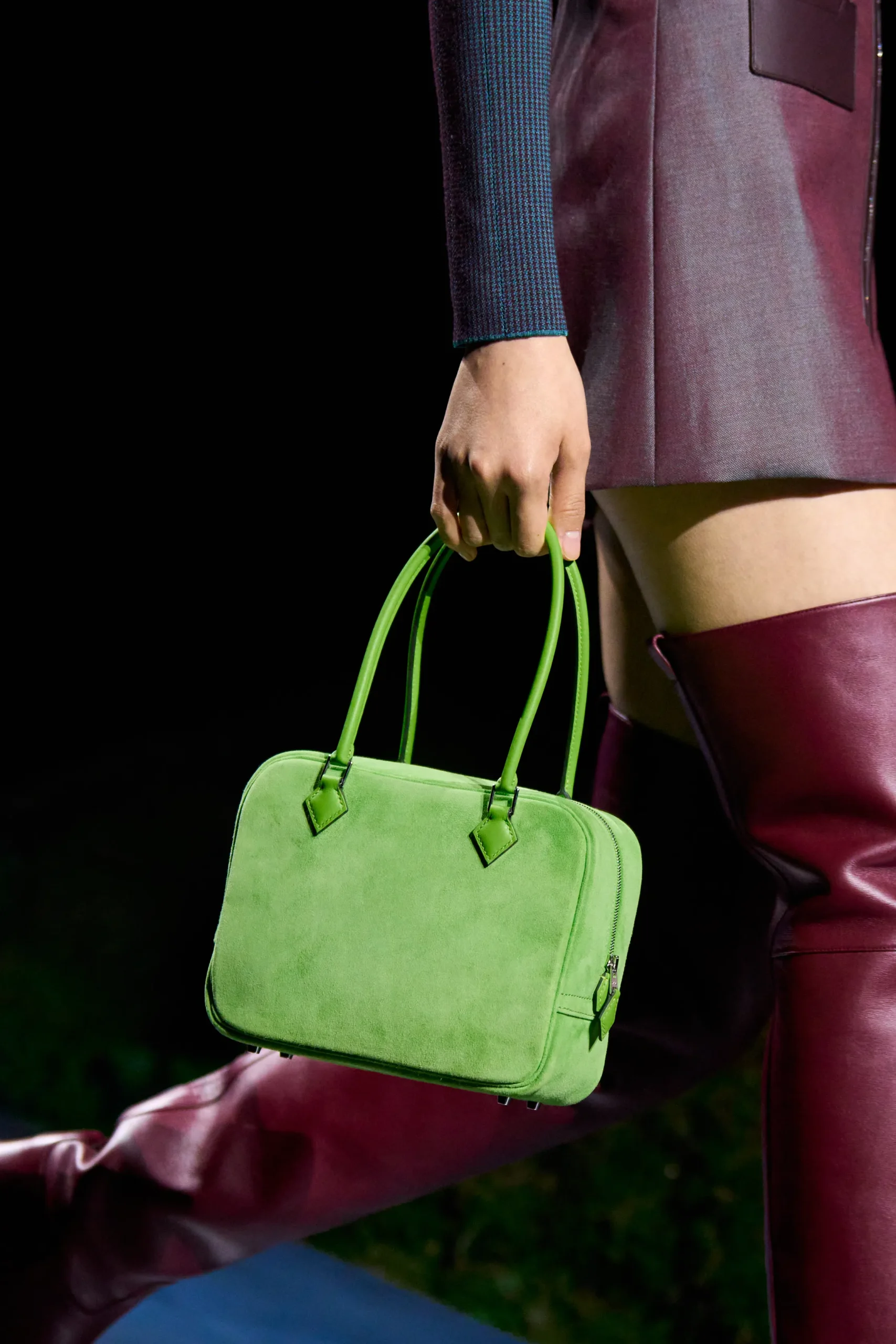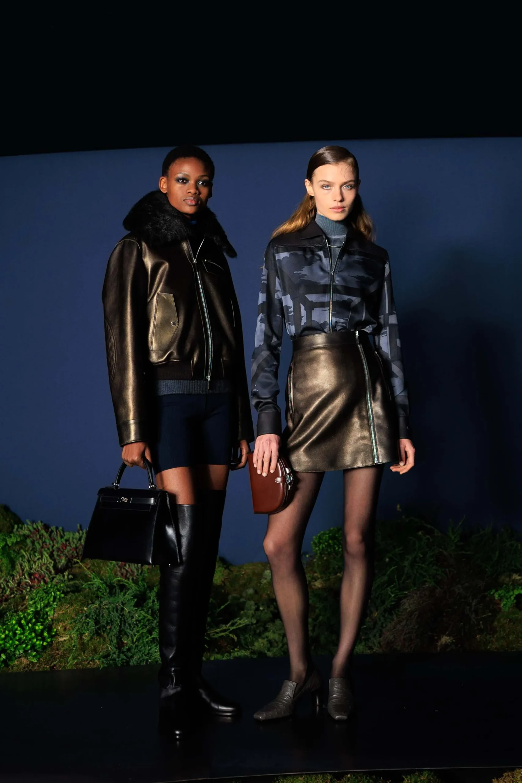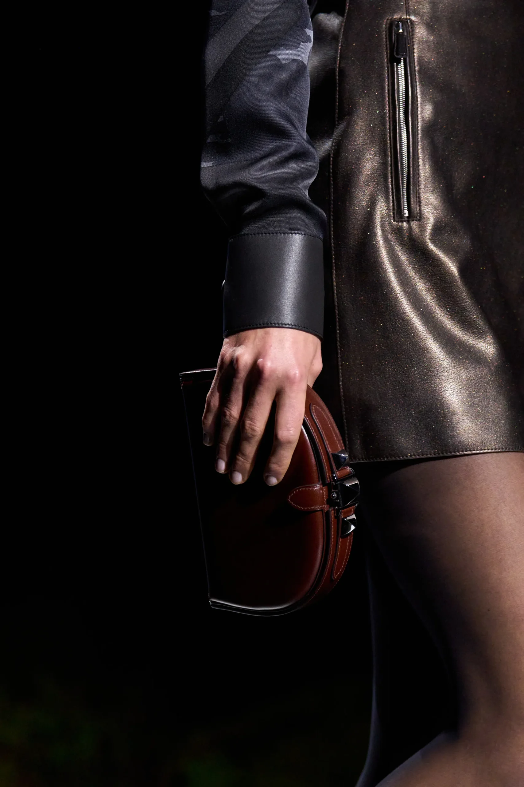 Inside-out contrasts emerged through shearling trims and flashes of color, softening leather while lending structure to softer fabrics—a look Hermès described “a modernist spirit, transfigured.” Equestrian references remained ever-present, from sharp houndstooth wool coats to jodhpurs with an iridescent weft, with one particular look carrying, in the Maison’s words, “the promise of a covert night ride at dusk.”