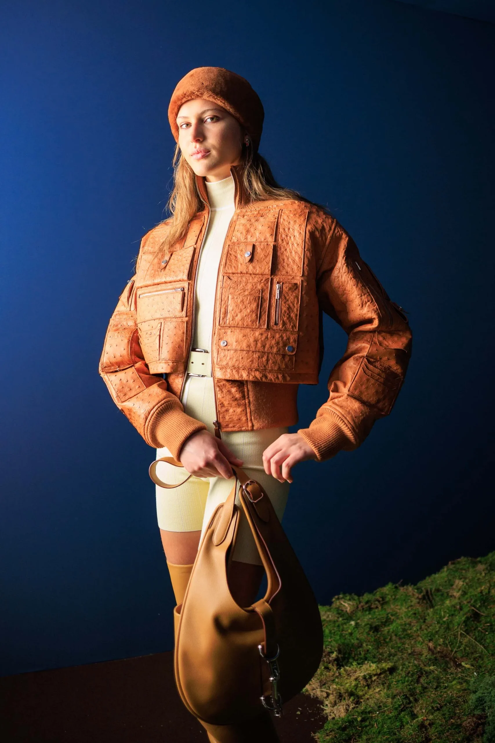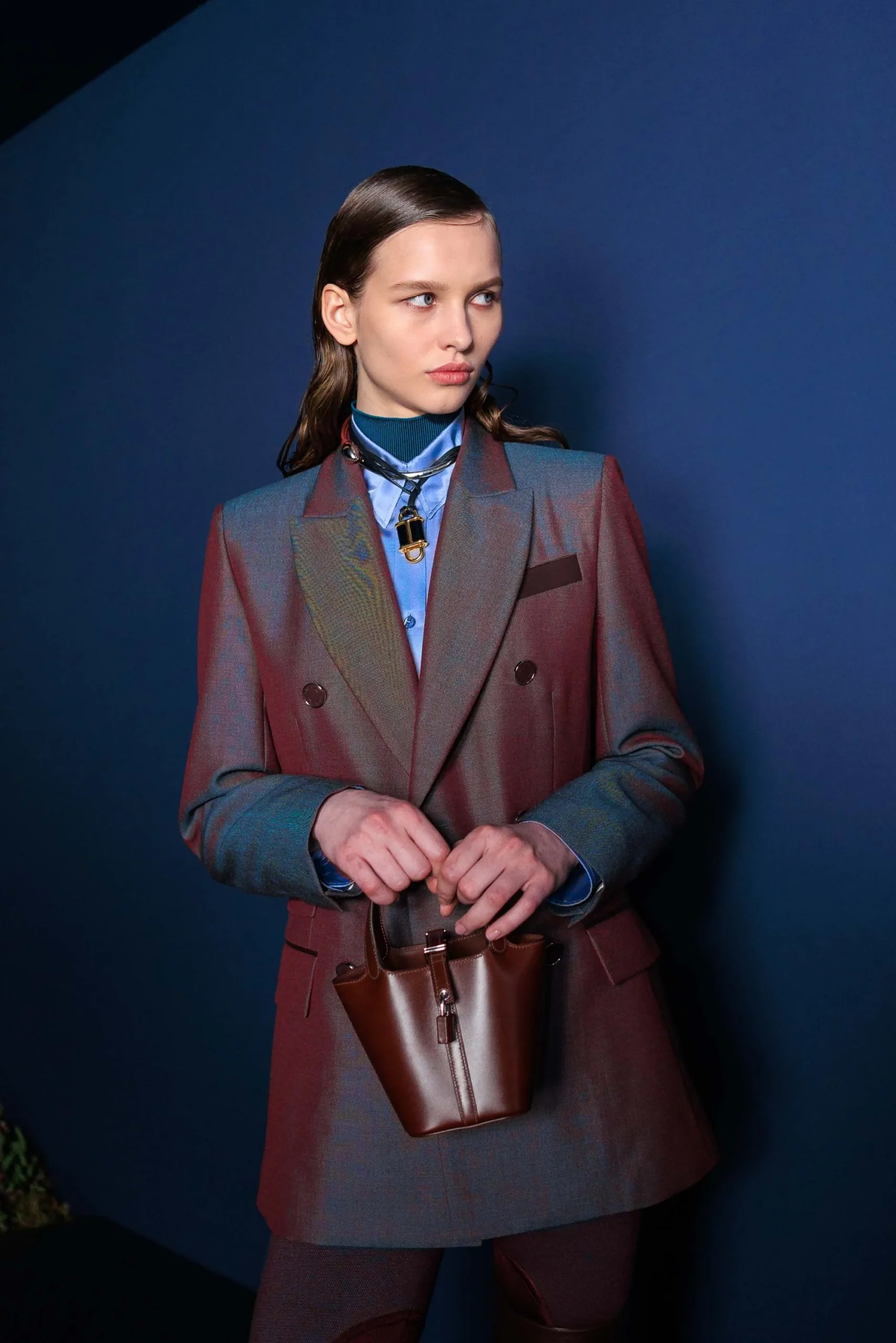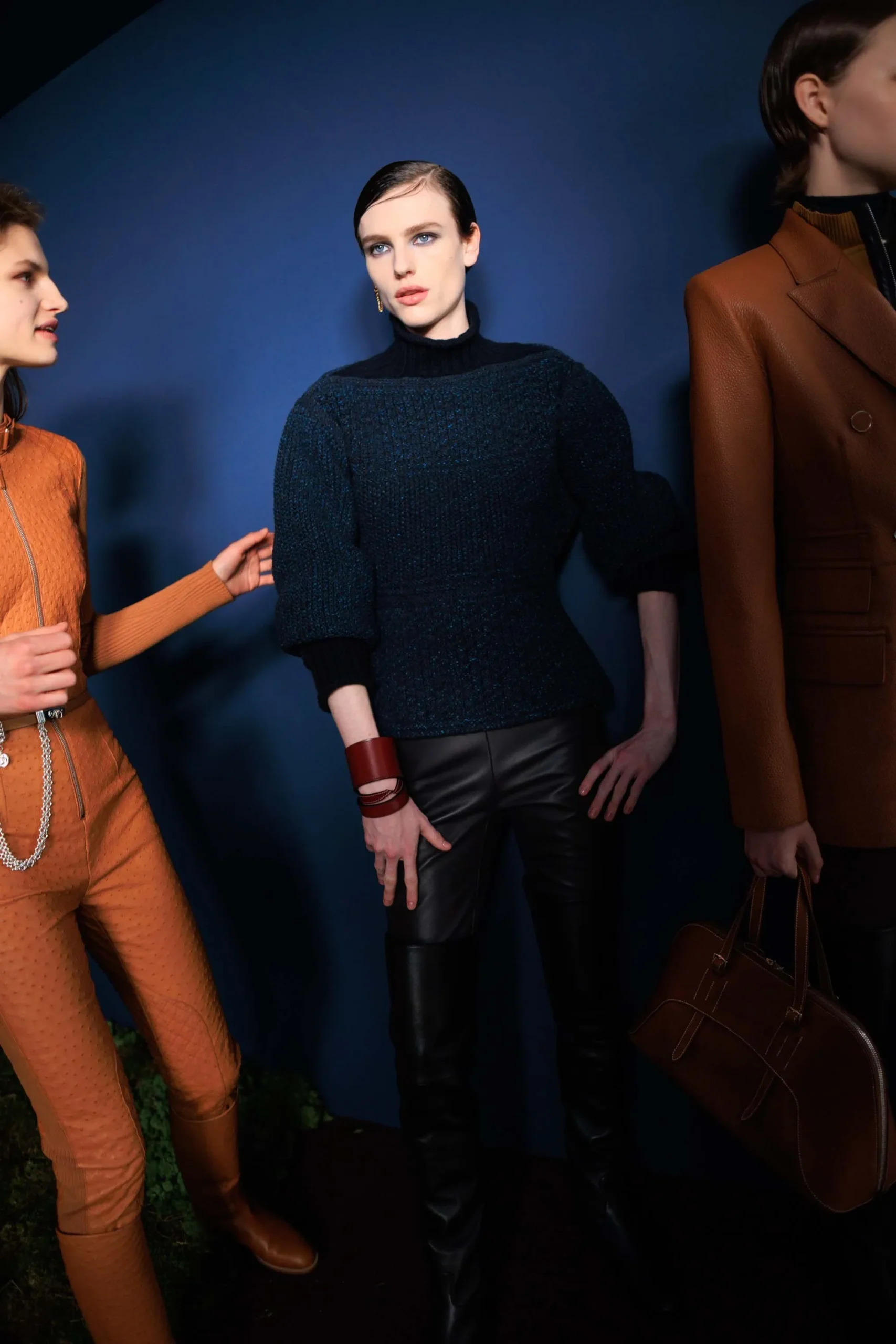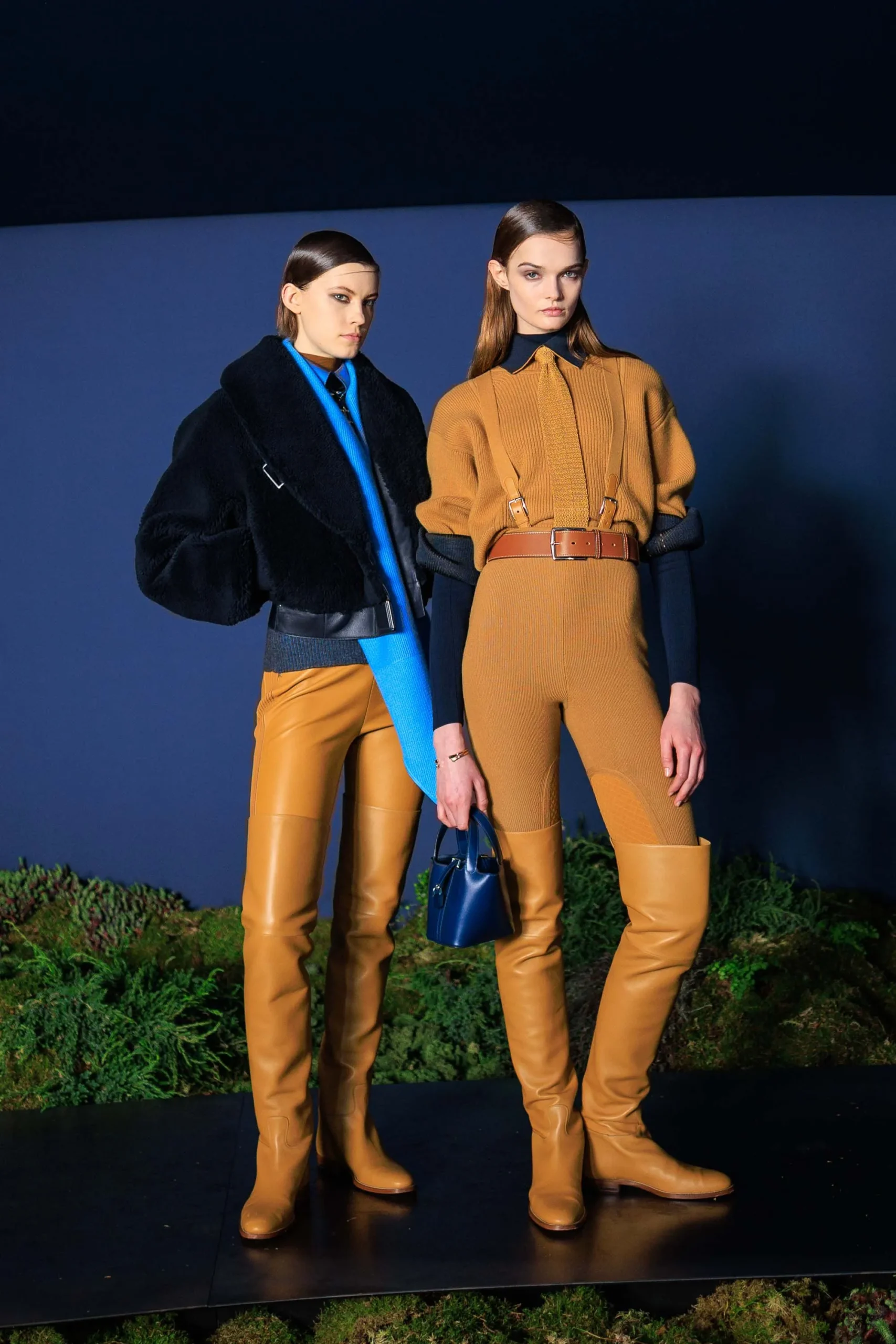 Inside-out contrasts emerged through shearling trims and flashes of color, softening leather while lending structure to softer fabrics—a look Hermès described “a modernist spirit, transfigured.” Equestrian references remained ever-present, from sharp houndstooth wool coats to jodhpurs with an iridescent weft, with one particular look carrying, in the Maison’s words, “the promise of a covert night ride at dusk.”