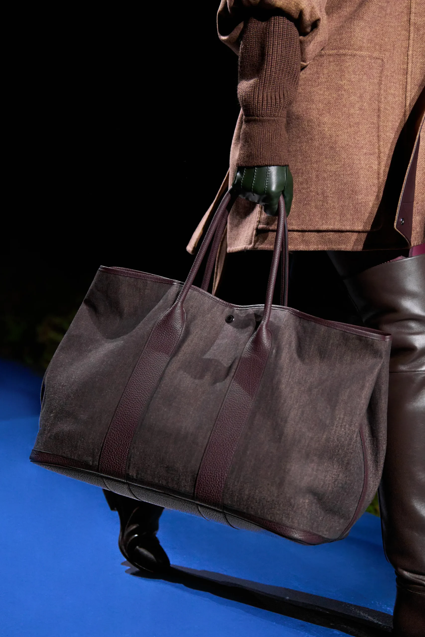The Garden Party appeared in the Voyage size, rendered in what appears to be a water-resistant canvas paired with tonal leather handles and trim. A second colorway in deep burgundy echoed the iridescent fabrics seen throughout the ready-to-wear collection.