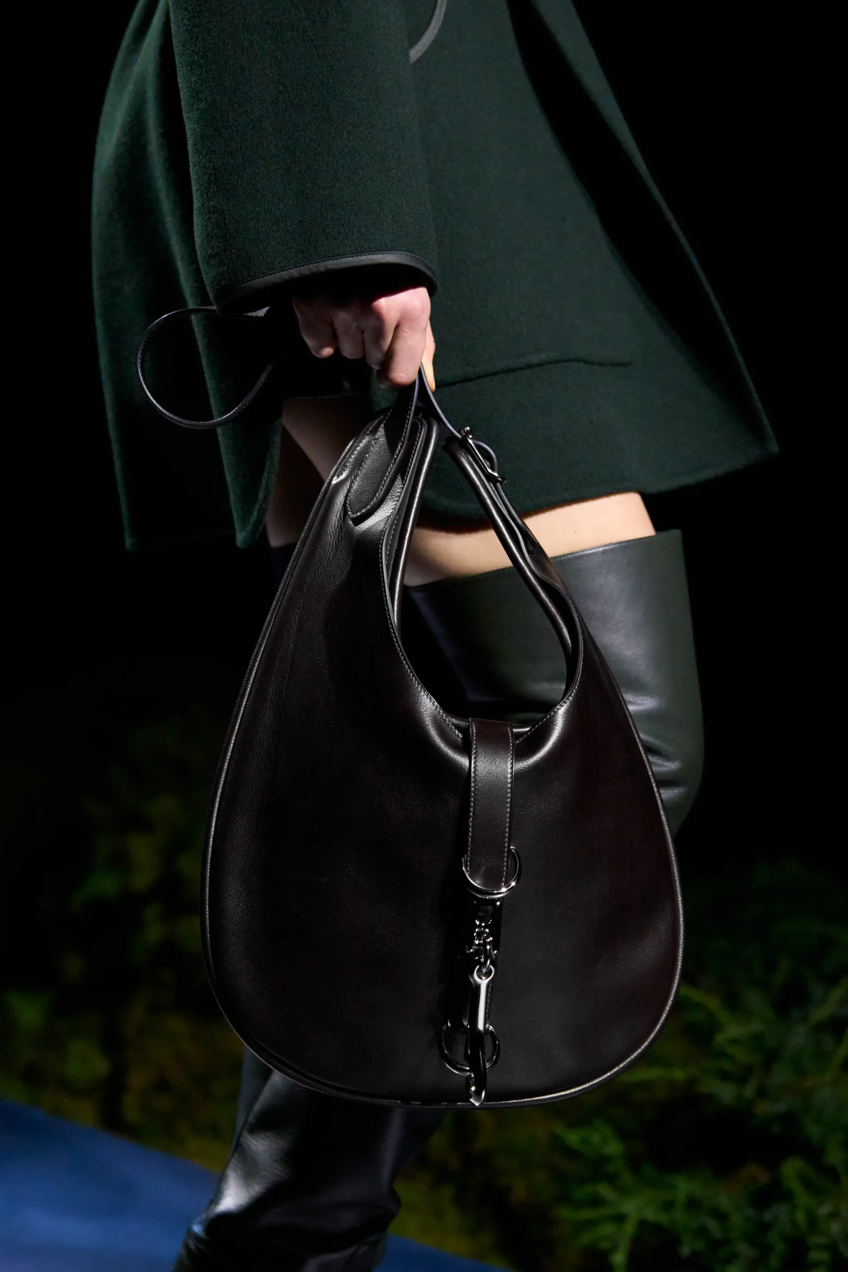 Returning for Autumn–Winter 2026 is the newly introduced Spring–Summer 2026 equestrian-inspired hobo. Smaller than the Arçon yet echoing its signature silhouette, the design features a slouchy, supple structure with a handle flowing seamlessly from the body. A secondary leather strap, reminiscent of a horse’s girth, fastens with a buckle at the top, allowing the bag to be carried by hand or over the shoulder.