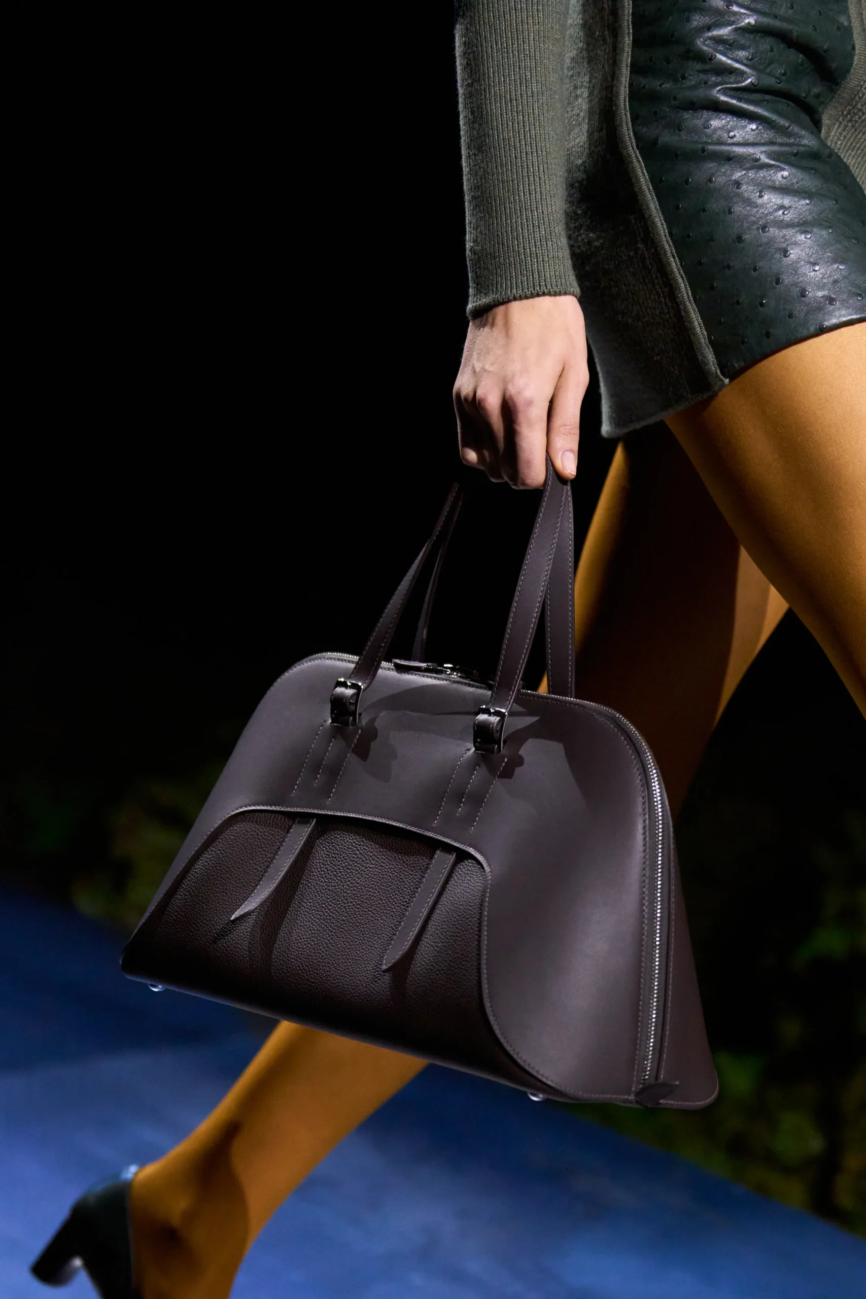 One of the new additions to the Hermès lineup this season is a curvaceous, structured bag that feels like a modern, equestrian reinterpretation of the classic Bolide. The construction is uniquely layered: a curved leather panel sweeps across the top of the silhouette, remaining open where the handles meet the body.