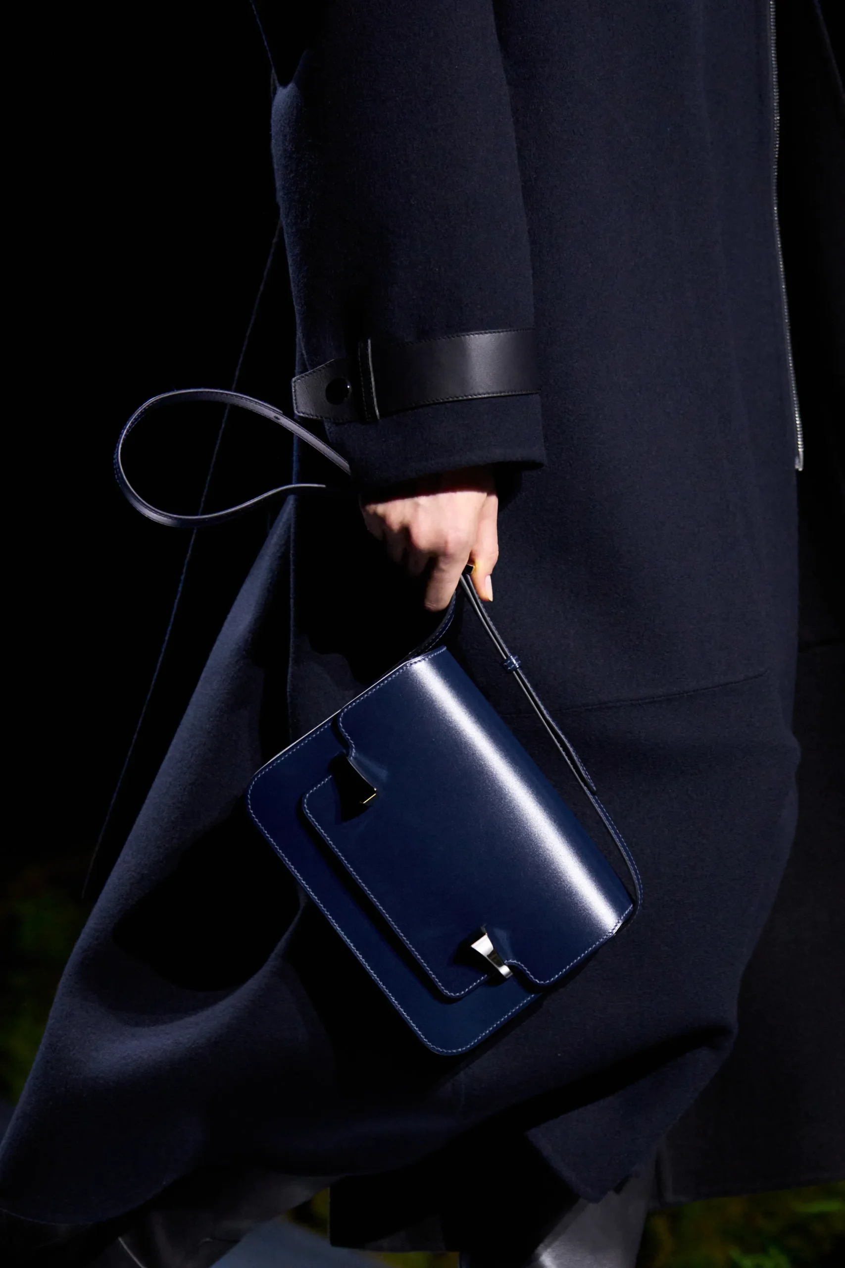 The first bag to appear on the runway was a new Medor clutch, crafted from glossy Box calfskin. Defined by its distinctive half-moon silhouette and hard-case construction, the bag is secured with a clasp adorned with Hermès’ signature Medor hardware. The clutch was presented in classic black with gold-tone hardware, as well an inky blue and Rouge Sellier paired with palladium accents.