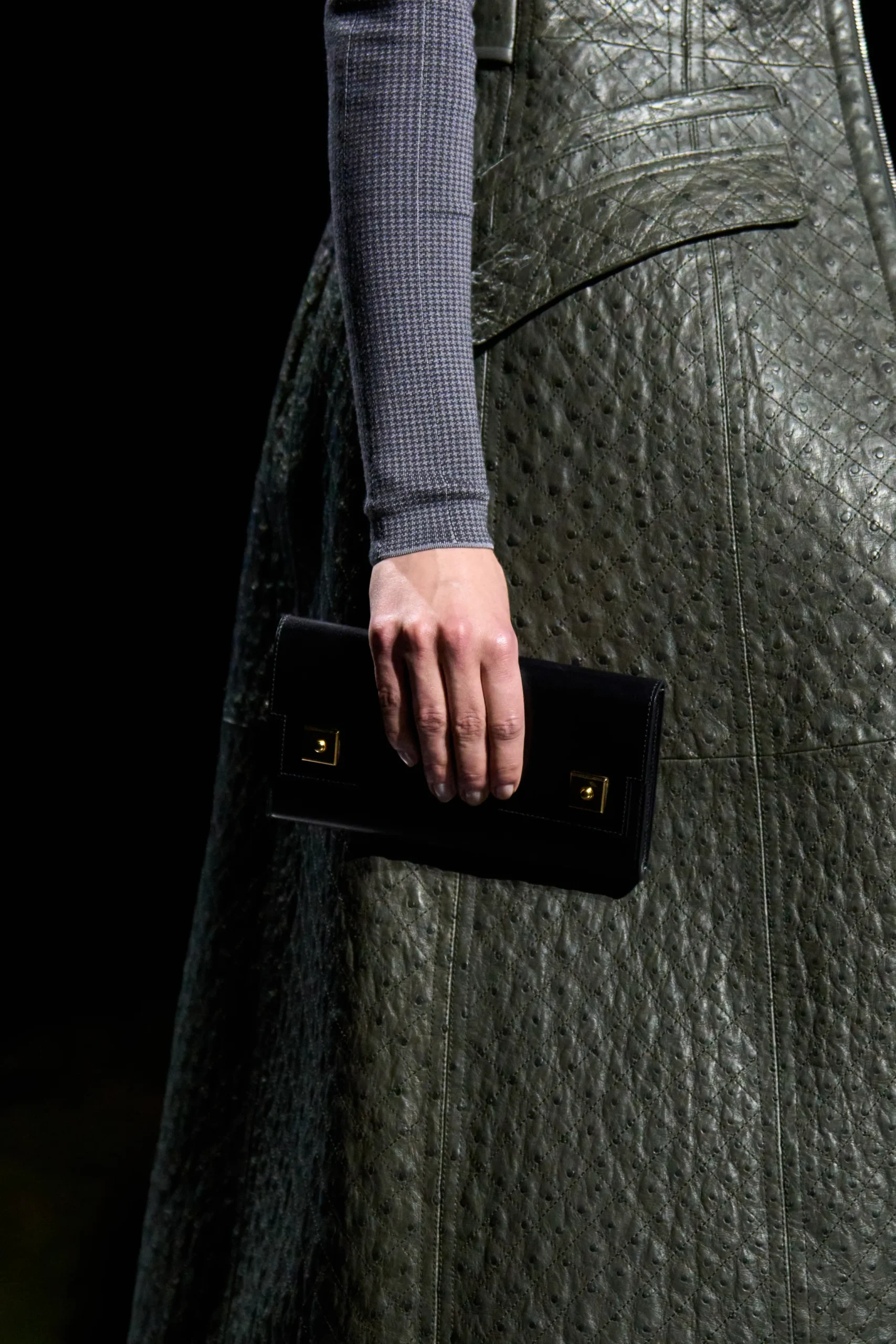 Another new clutch appeared on the runway, potentially signaling a fresh addition to Hermès’ popular ‘To Go’ line of small leather goods. Crafted in black Box calfskin, the sleek, longline wallet-style design features a flap-front closure accented with two studded square plaques in gold-tone hardware.