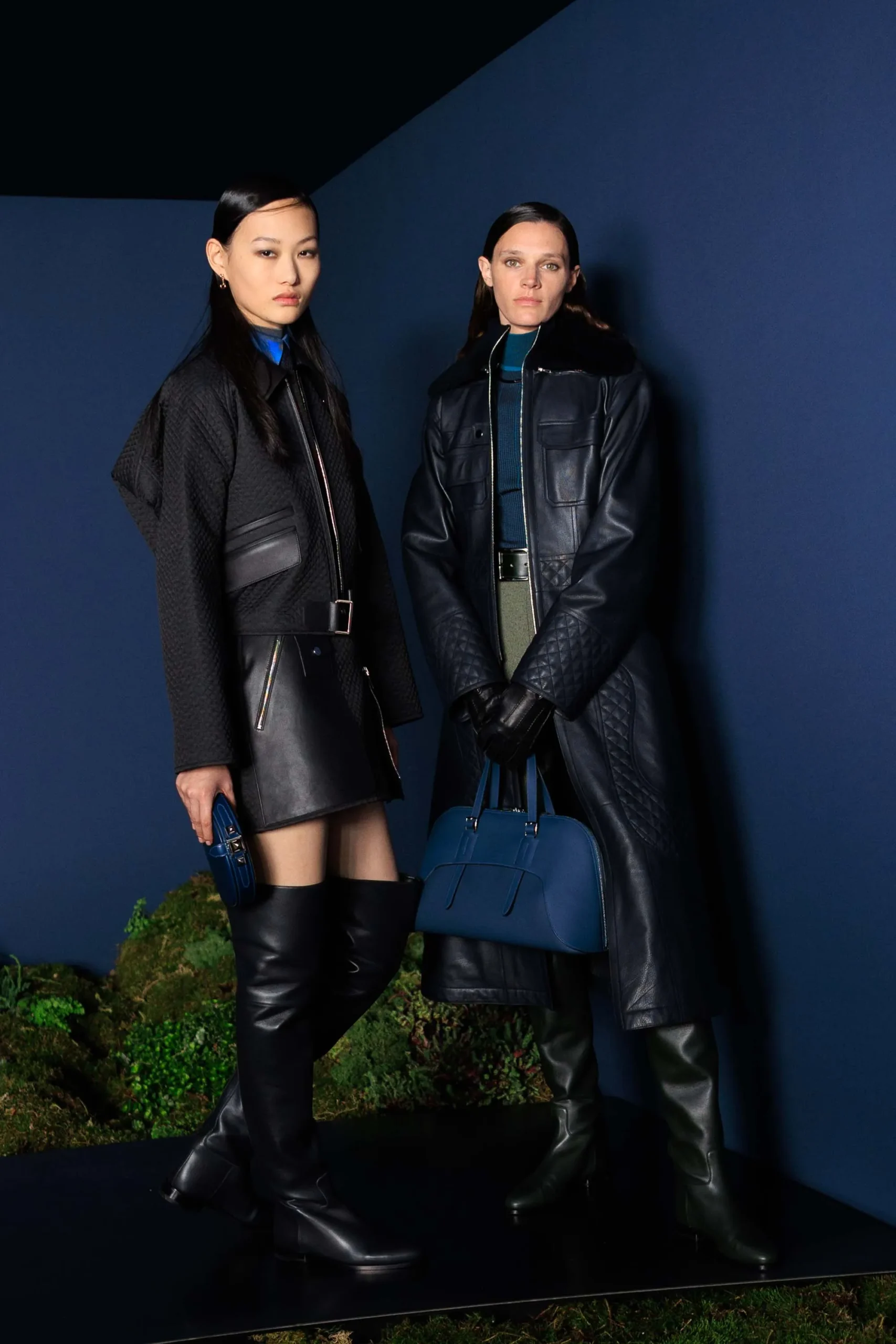 The runway collection embraced the season’s cooler temperatures with layered styling: short jackets paired with thigh-high boots and streamlined leather pants for a continuous, seamless silhouette. Polo necks peeping from beneath wool and leather coats, while short skirts were layered over matching sheer colored tights.