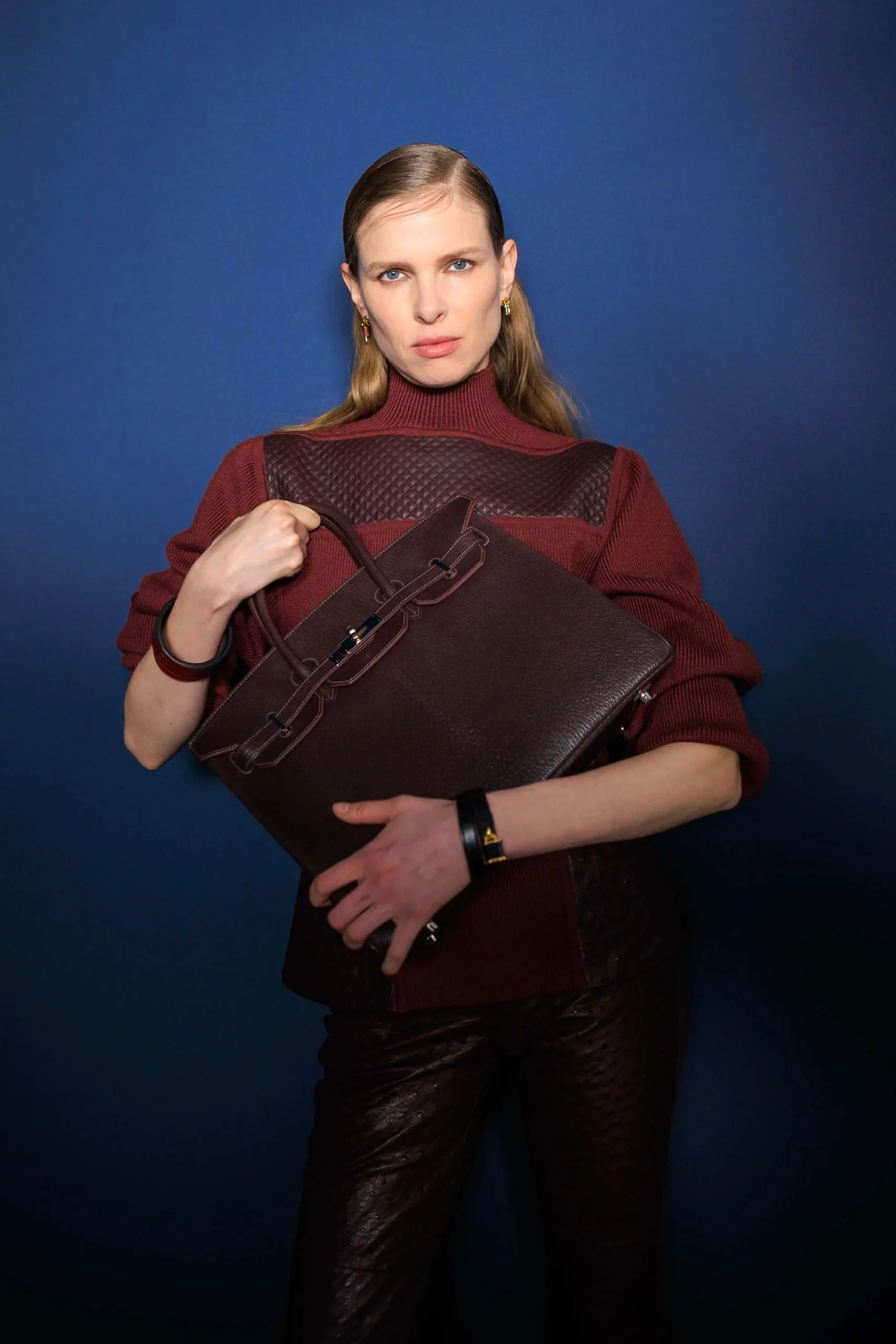 Not to be missed, a single Birkin appeared on the Autumn–Winter 2026 runway, rounding out the season’s iconic duo alongside Kelly. Presented in Rouge Sellier, this classic 35 cm silhouette was crafted in what appears to be Chèvre leather.