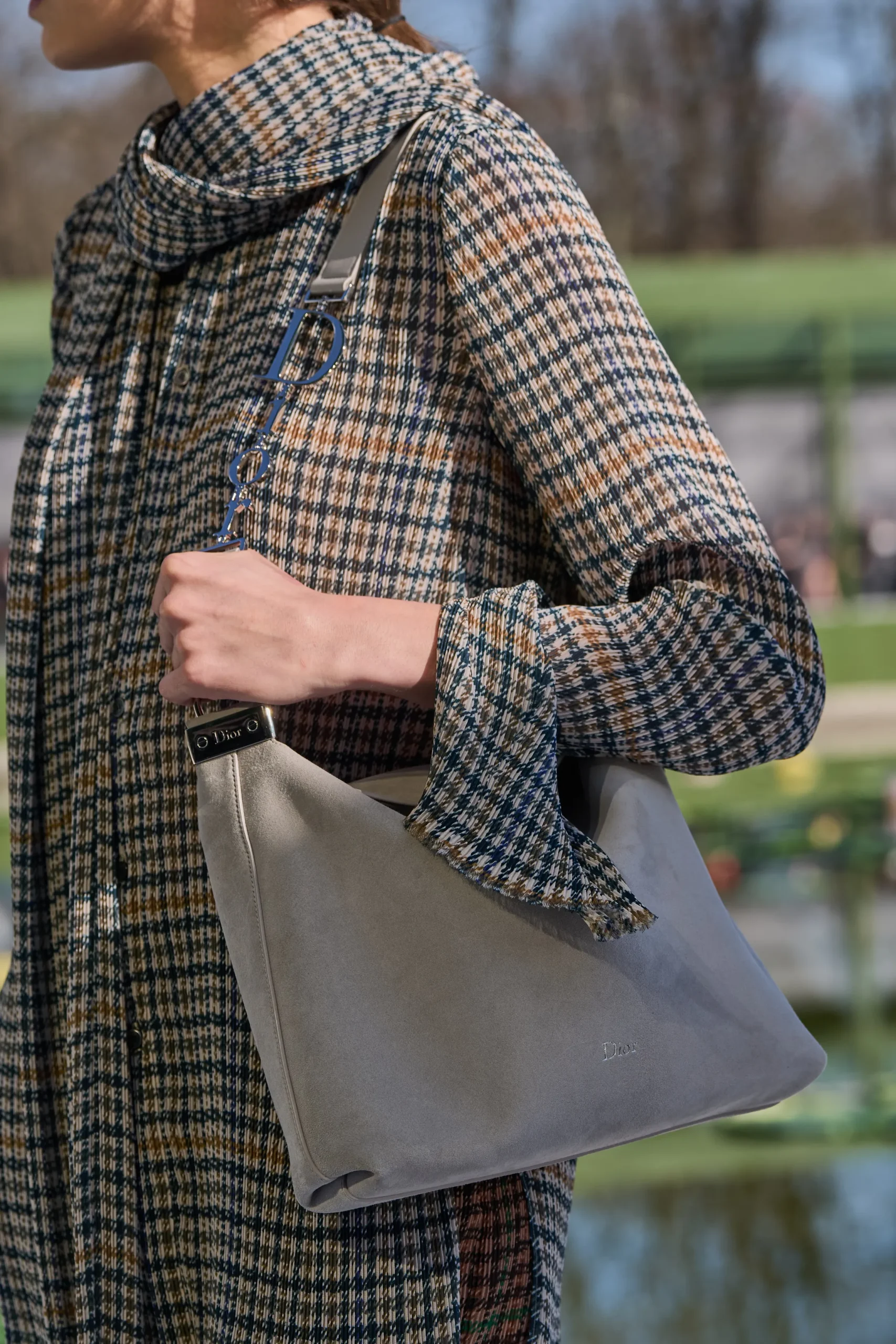 Also joining the lineup is a messenger-style bag, echoing the design seen on the men’s Fall–Winter 2026 runway. This familiar full-flap bag is reinterpreted in fresh fabrics and seasonal colors, and scaled down for a more compact, versatile fit. Crafted from textural tweed and featuring an oversized Macrocannage pattern with the Dior Médaillon motif, it’s finished with a wide, adjustable shoulder strap, an oversized buckle, and a subtle chain detail. Presented in deep gray, light gray, and pale pink, the lineup also included a tactile light gray fur version for added texture.