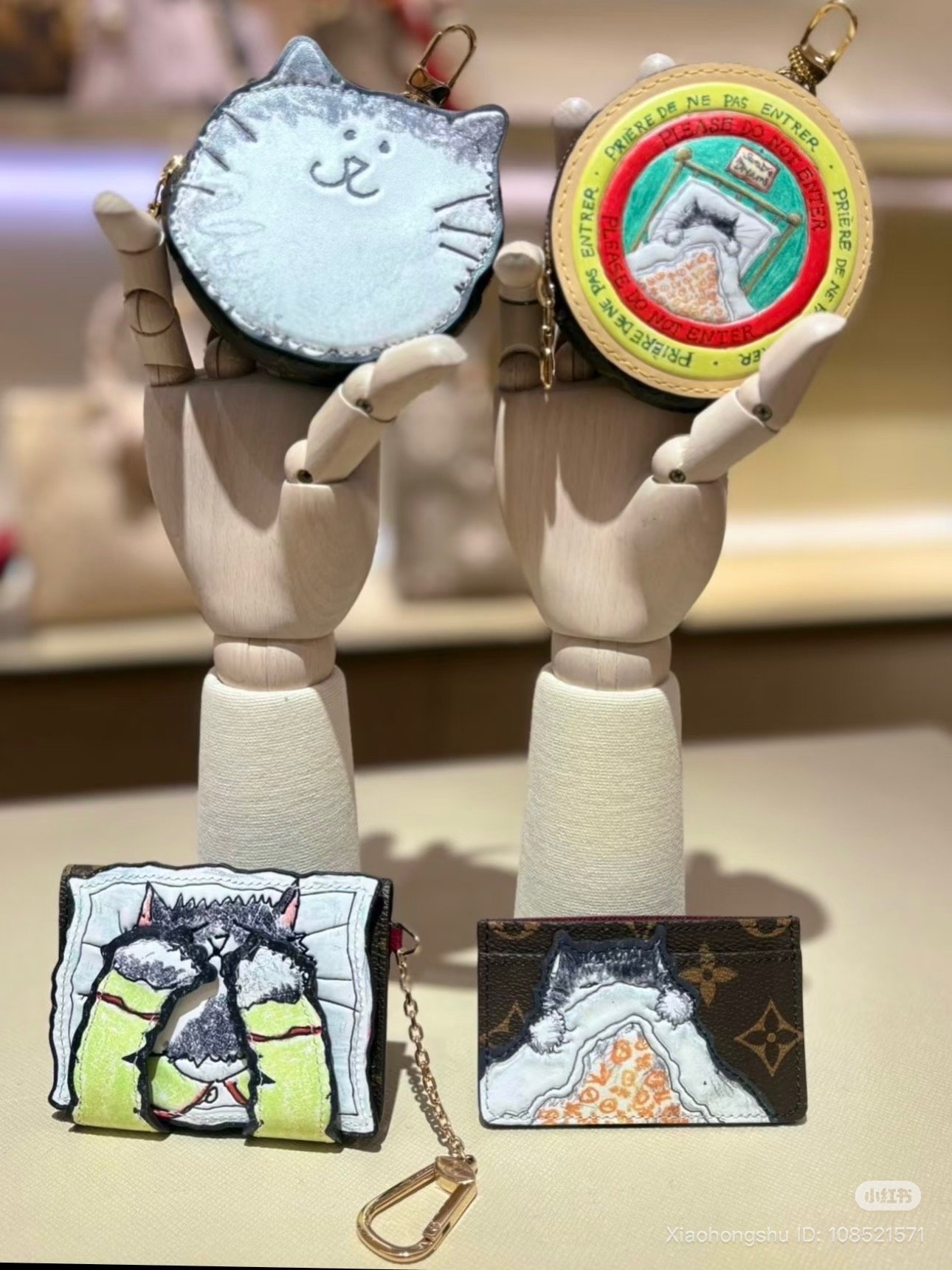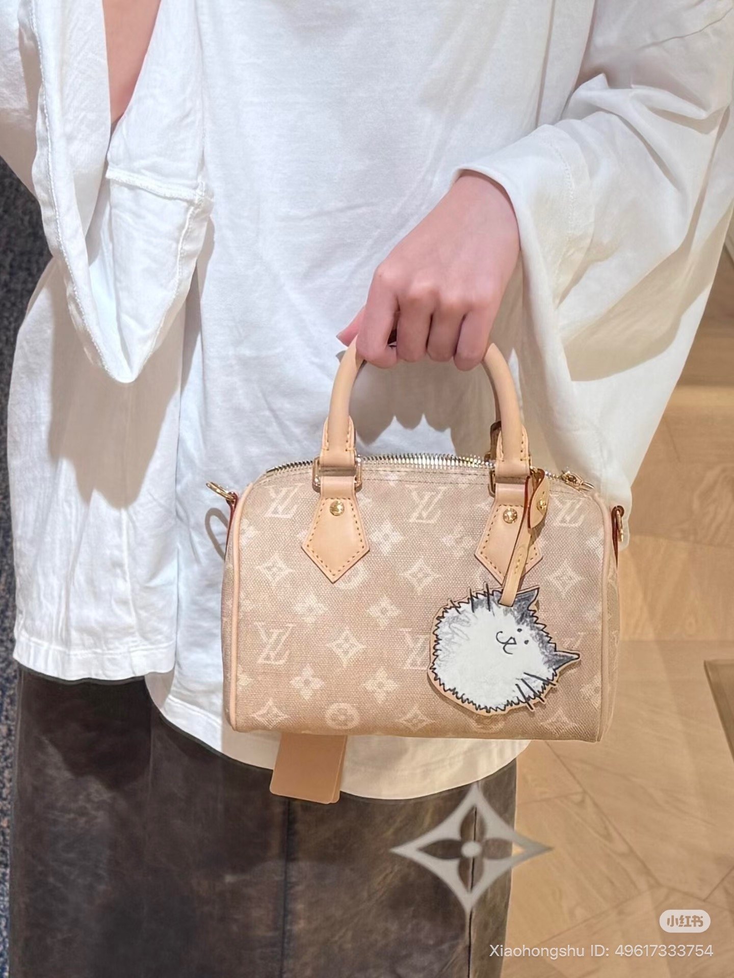 For bags, Louis Vuitton reimagines travel staples with a cat-inspired twist. The collection features classics like the Neverfull Inside Out GM, OnTheGo Organizer, and Keepall Bandoulière 45, crafted from beige vintage-style Monogram linen canvas paired with cat-shaped clochettes, and each finished with a cat-and-mouse printed lining. Meanwhile, the Horizon 55 Business stands out with the “Meowgram” motif, injecting extra feline flair into the classic carry-on.