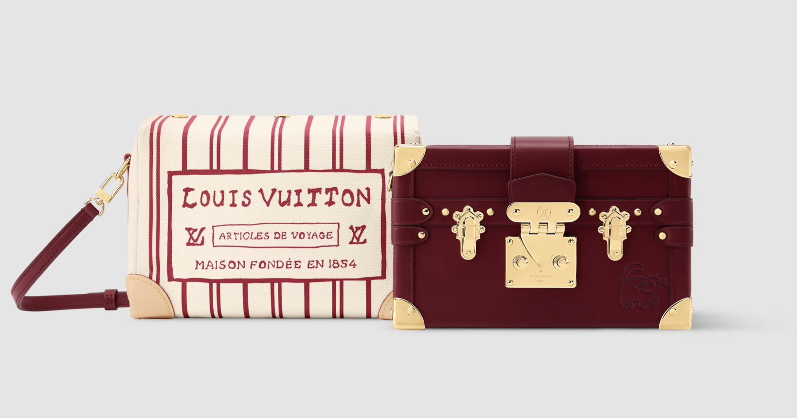 Shifting from linen to leather, the collection explores a richer palette. The Speedy Soft 30 appears in Plum calfskin, accented with gold-toned hardware and a removable cat-shaped clochette. Adding an extra touch of charm, the bag also features a removable luggage tag printed in Grace Coddington’s handwriting. The Petite Malle, also available in Plum, shares the same hand-drawn aesthetic with a removable textile cover featuring a Louis Vuitton travel patch, allowing you to switch up the look between two styles in one bag.