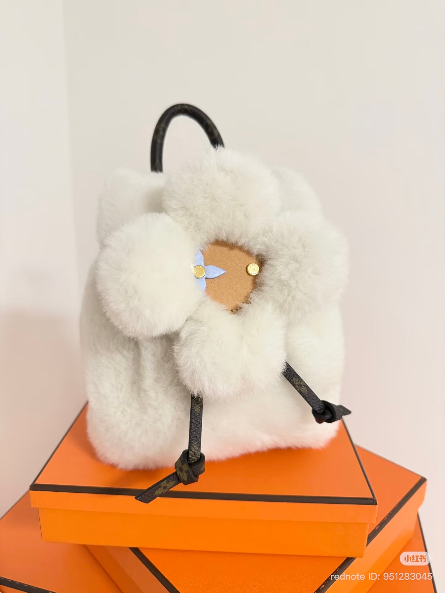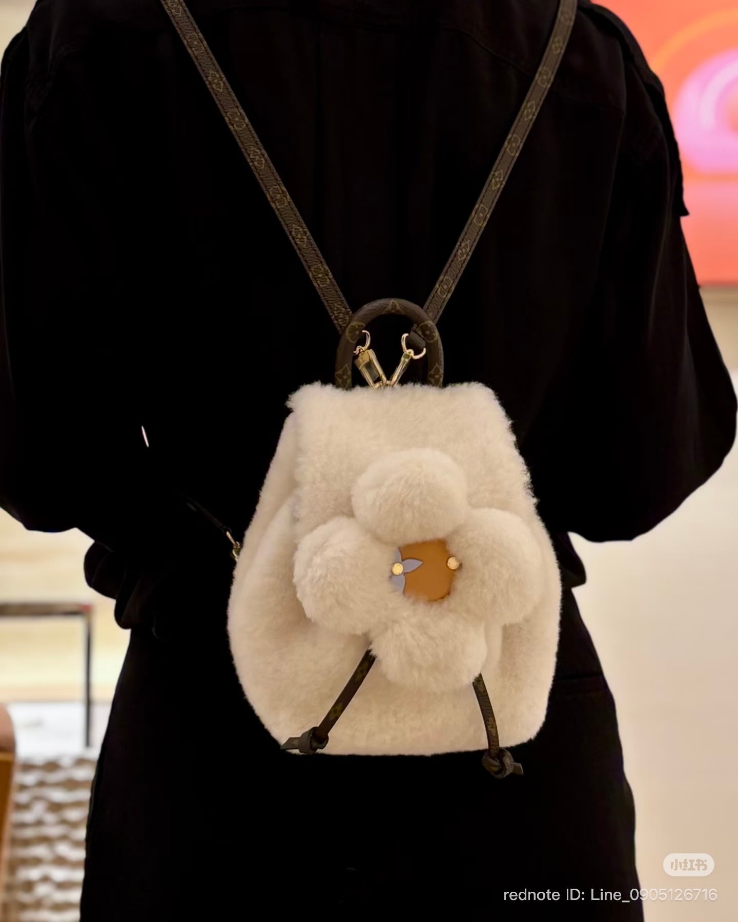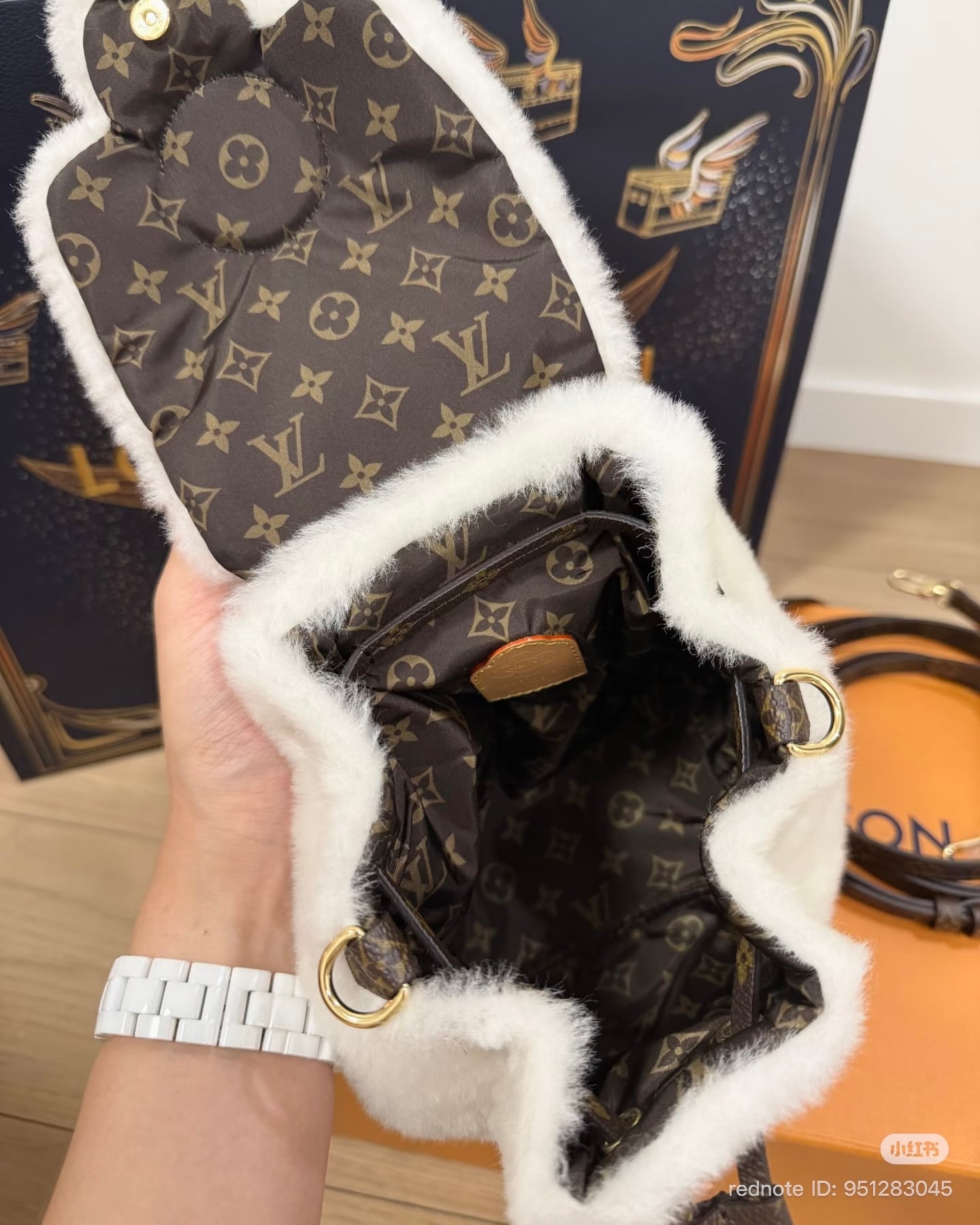 Carrying the shearling story into an even more statement direction, the Viv-ified Backpack delivers a soft, sculptural take on everyday practicality. Crafted entirely from plush white shearling and trimmed with signature Monogram canvas across the handles, drawstrings, and straps, it leans into the season’s cosy aesthetic while staying true to classic LV codes. A Vivienne-shaped flap conceals the magnetic closure, opening to a surprisingly roomy interior sized at 6.3 x 6.7 x 3.9 inches—ideal for essentials like a smartphone, small wallet, keys, and lipstick. Finished with gold-toned hardware, a drawstring fastening, and a removable, adjustable strap (drop 15.0–18.5 inches), the Viv-ified Backpack retails for $4,050.
