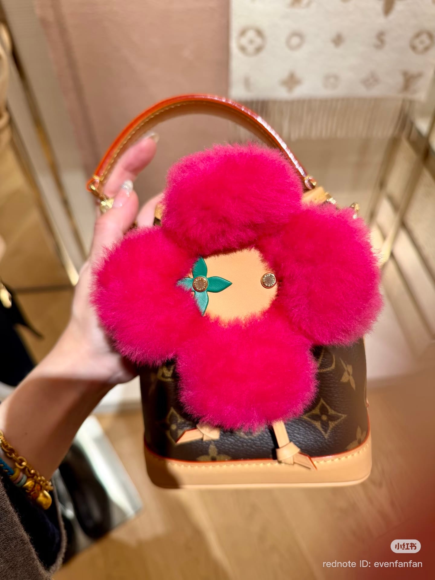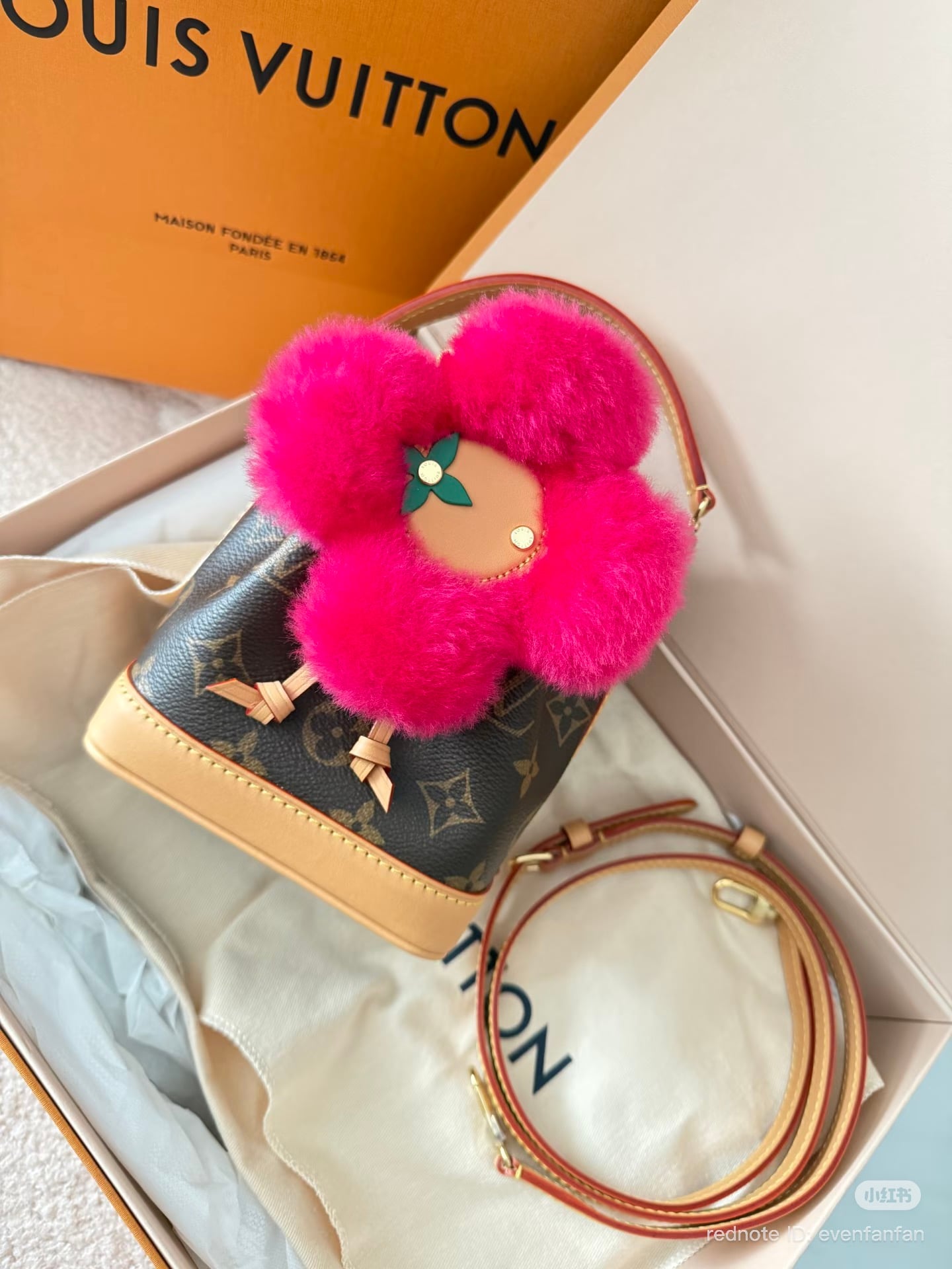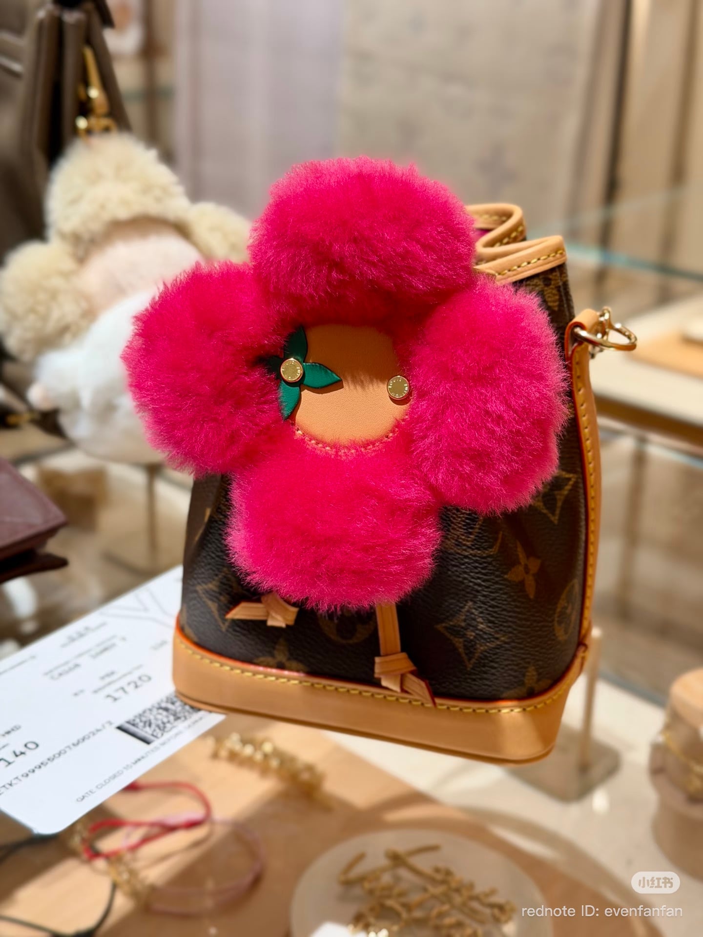Rounding out the Monogram canvas handbag lineup, the Noé-Where Vivienne brings a statement look to the timeless bucket bag. Retaining its signature Monogram canvas body and Vachetta leather base and trim, the design is elevated with an oversized shearling detail in a vibrant Frozen Orchid shade inspired by Vivienne. Compact yet practical at 5.1 x 6.3 x 3.9 inches, it fits everyday essentials like a smartphone, wallet, keys, and lipstick, while a removable, adjustable strap (drop 17.9–21.3 inches) and single handle allow for shoulder or hand carry. Finished with gold-toned hardware, a drawstring closure, and matching Frozen Orchid textile lining, the Noé-Where Vivienne retails for $2,450.