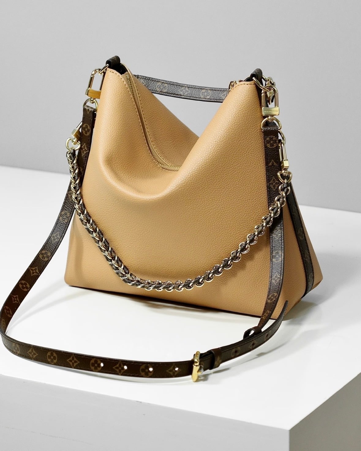 Meet the Multipass handbag, a new-season evolution inspired by the Express that debuted for Fall-Winter 2025. The softly slouchy silhouette is crafted from supple calfskin leather and framed with signature Monogram canvas trim. Three removable straps provide versatility: a gold-toned braided chain that lends a jewelry-like accent, a long adjustable strap for shoulder or crossbody wear, and a short top handle that tucks neatly into the crook of the arm or works handheld.