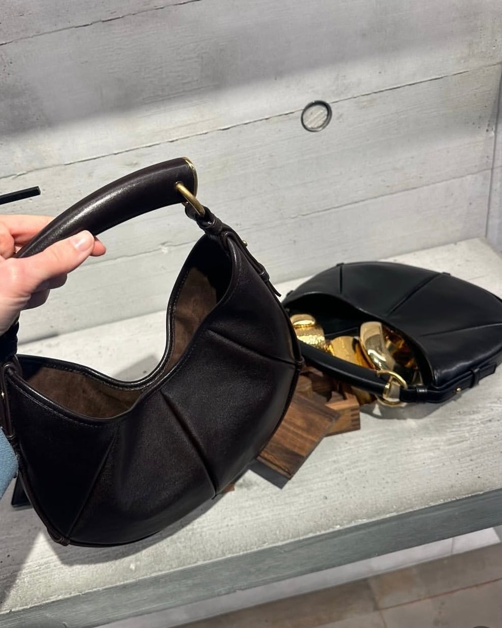 The body retains the original’s curved seam construction, now rendered in padded calfskin. Three prominent seams run across the silhouette, shaping its crescent form — a detail carried over from the archive, but amplified by the added volume of the leather. A structured leather trim frames the bag, reinforcing the shape and anchoring the handle in place.