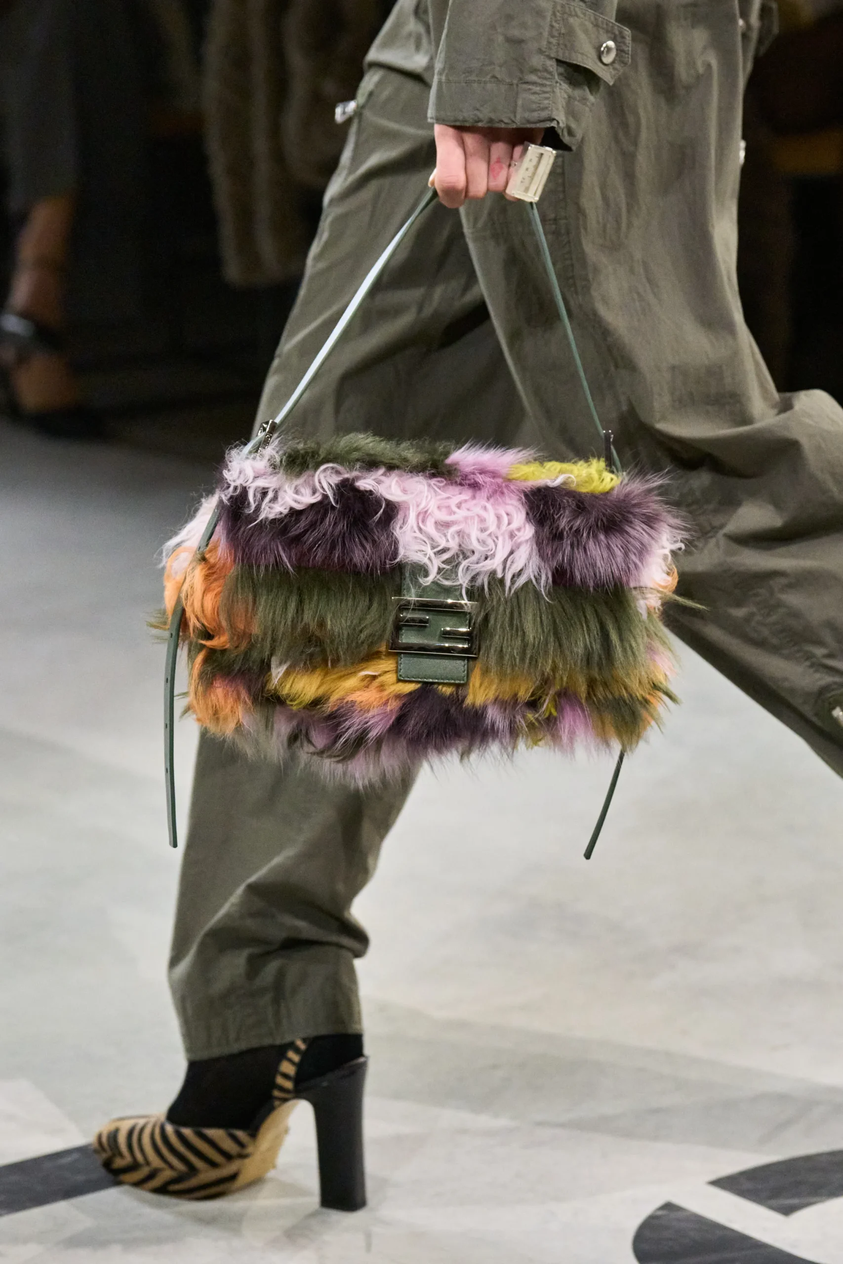 Chiuri also reintroduced the Fendi Mamma Baguette in black fur, carried clutch-style on the runway.