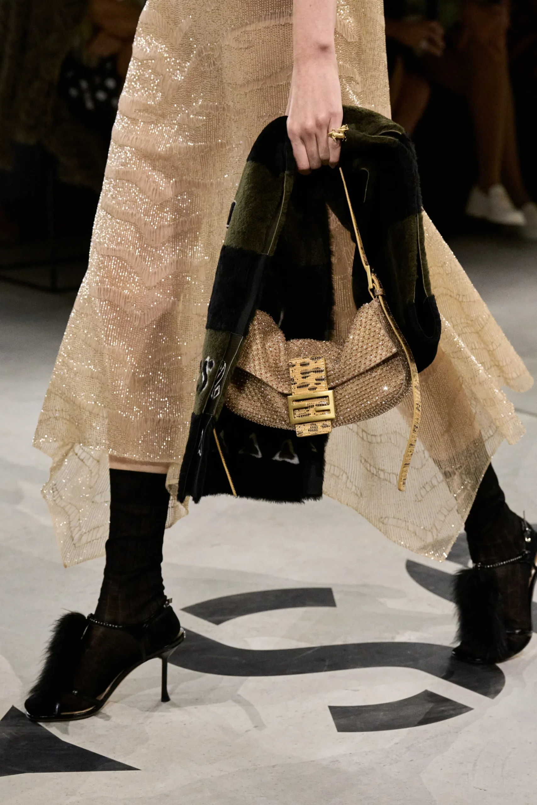 Bags played an important role throughout the show—a marked contrast to Chiuri’s Resort 2026 finale at Dior, where accessories were notably absent. Leading the lineup was the 90s fan-favorite Baguette, which never really disappears. For the show, last season’s reissued Fendi Spy didn’t make the cut.