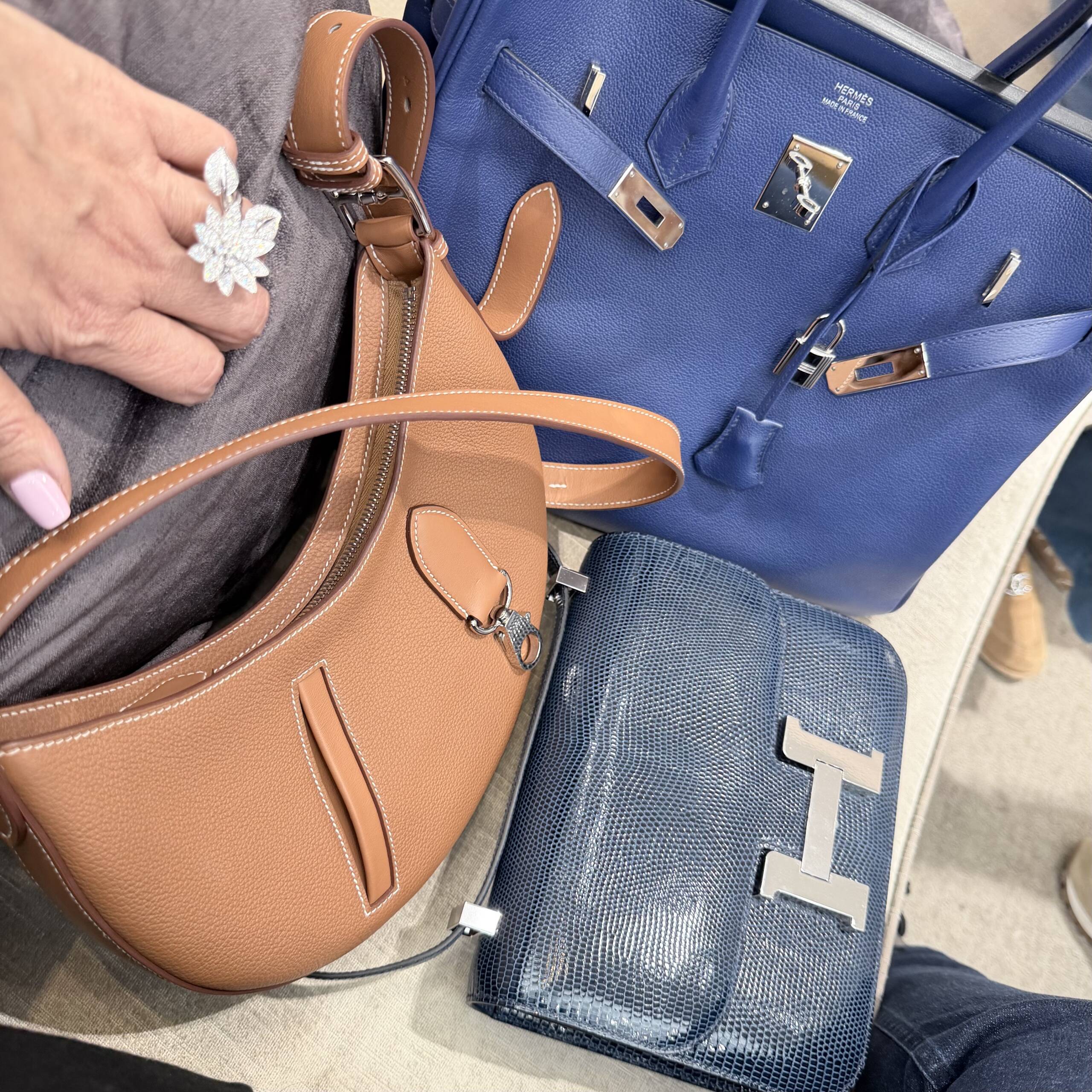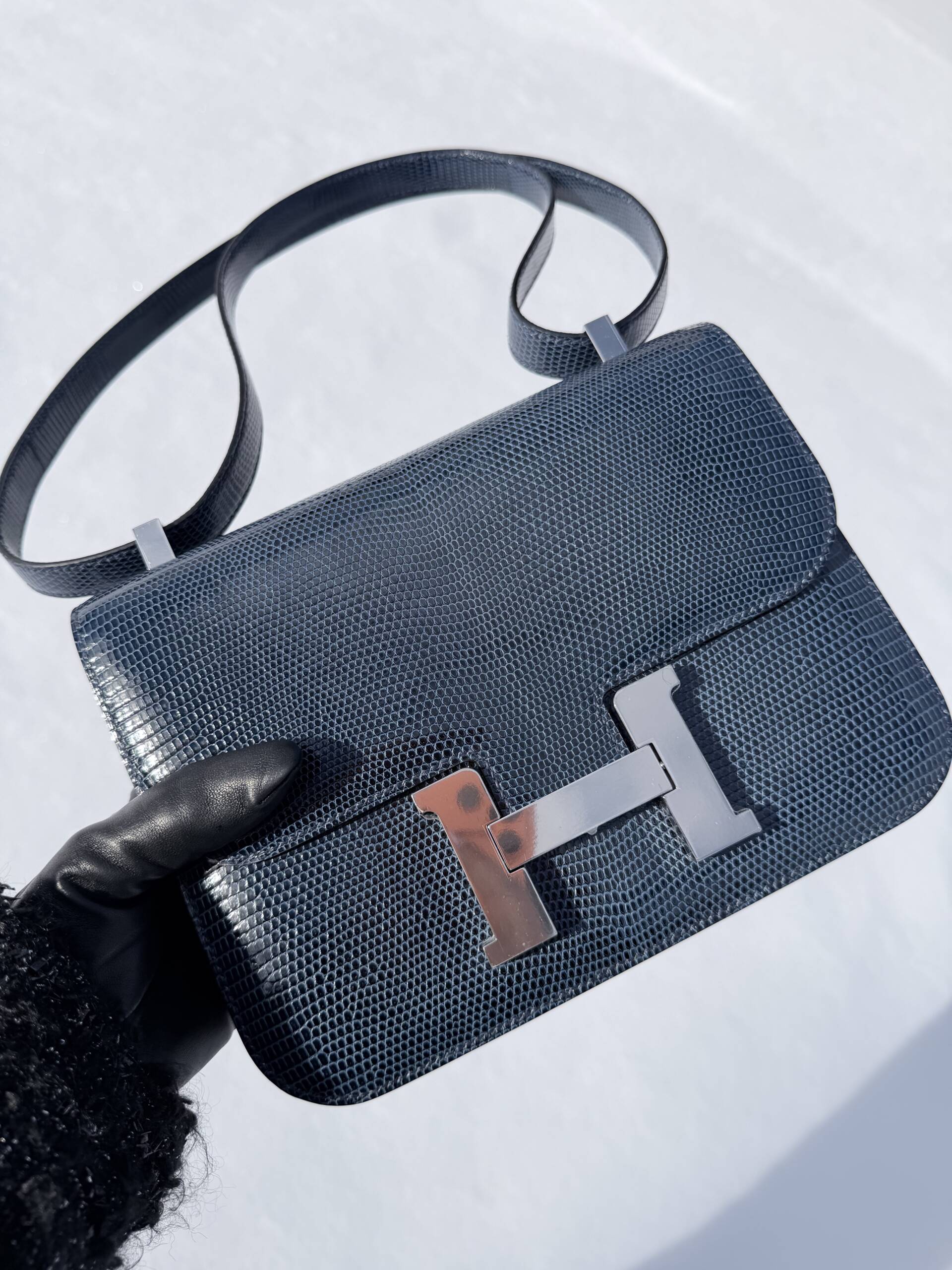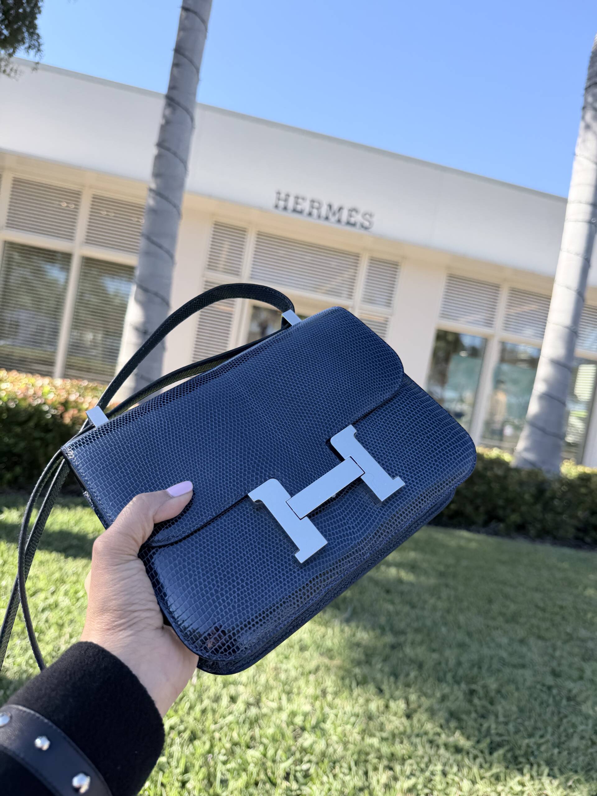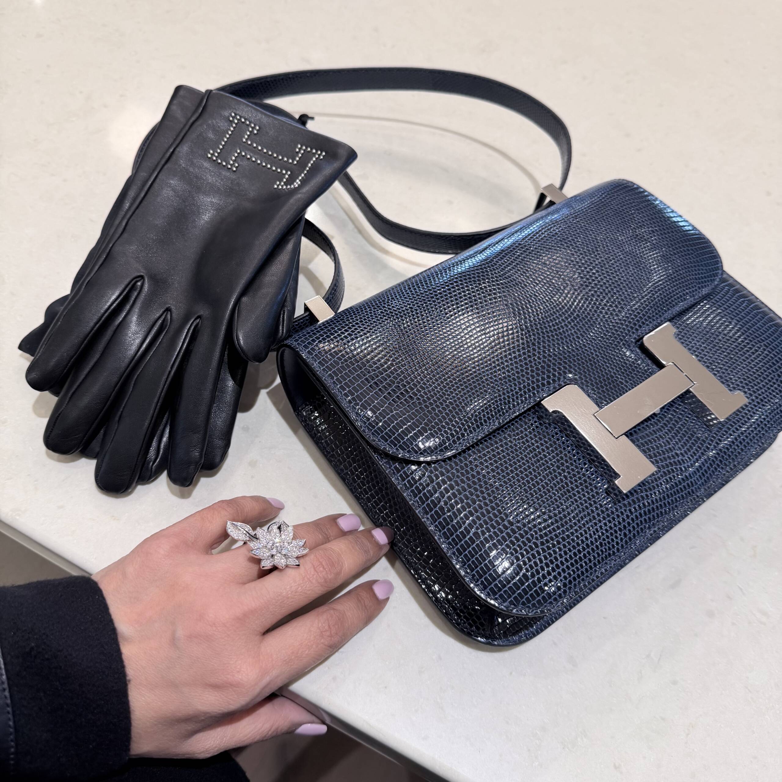 I mean who refuses anything lizard. Not me, but I was a bit concerned about where color conversation was headed. As the bag fully revealed itself from the felt, what I saw was the most exquisite lizard skin in a shade of blue that could be considered some sort of indigo, but with a unique hint, and I repeat just a hint, of maybe a steel gray. What was before my eyes was breathtaking, but yes, in a color I would have never considered previously, not even in a lizard. And now, the fact that the Constance she pulled out was in the newest released size of the 1–24, and not a C18, made it even more exciting as the bag exudes a casual vibe. Perfect for my new “blue jean era.”