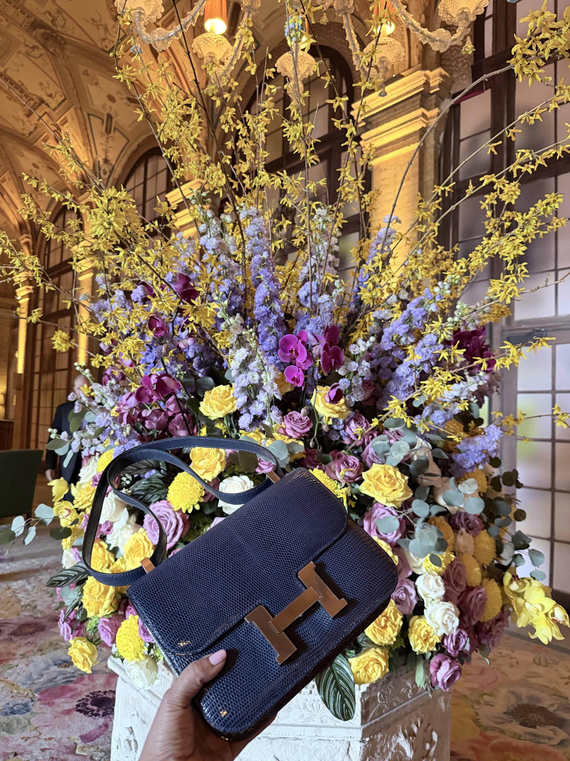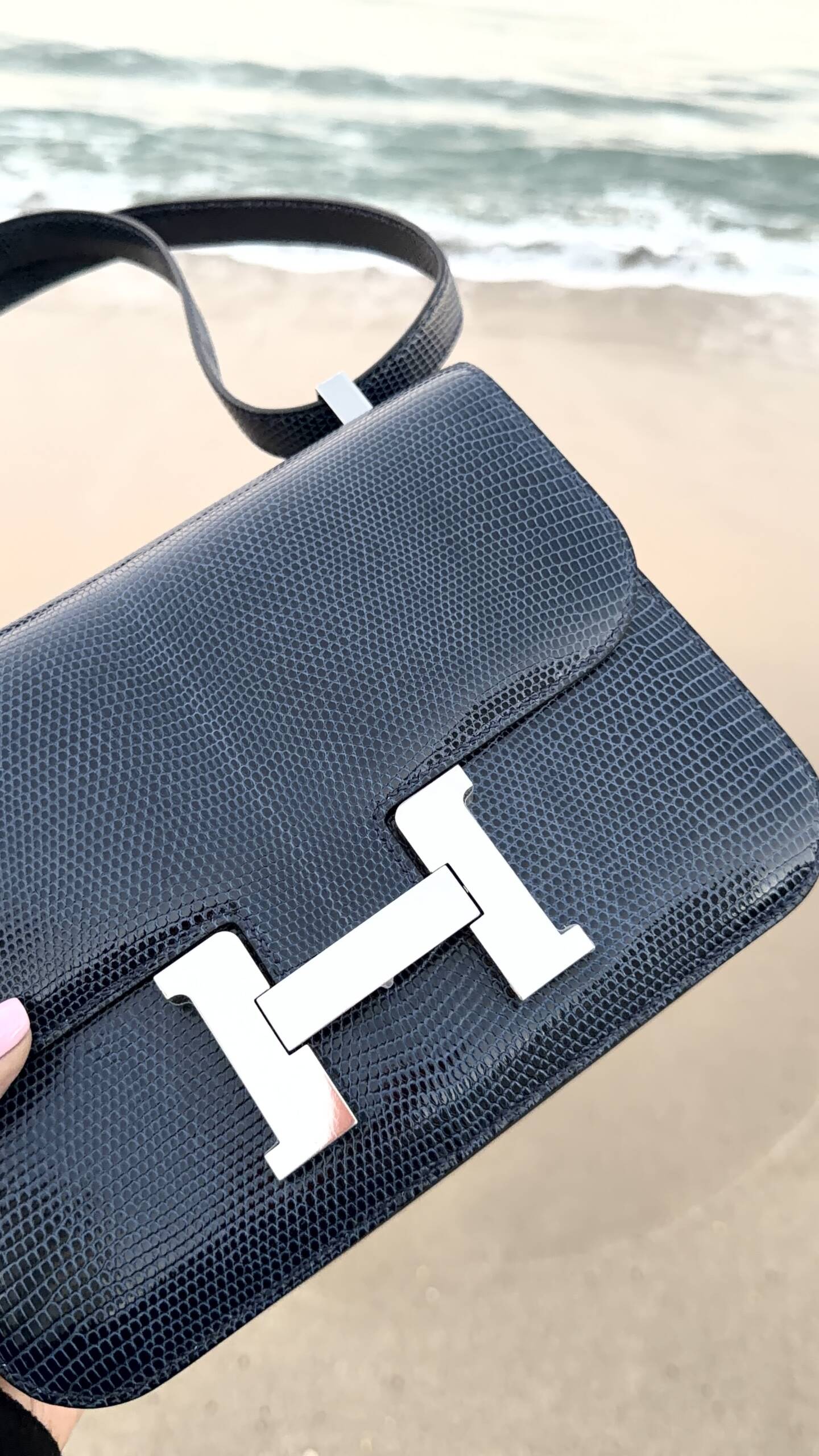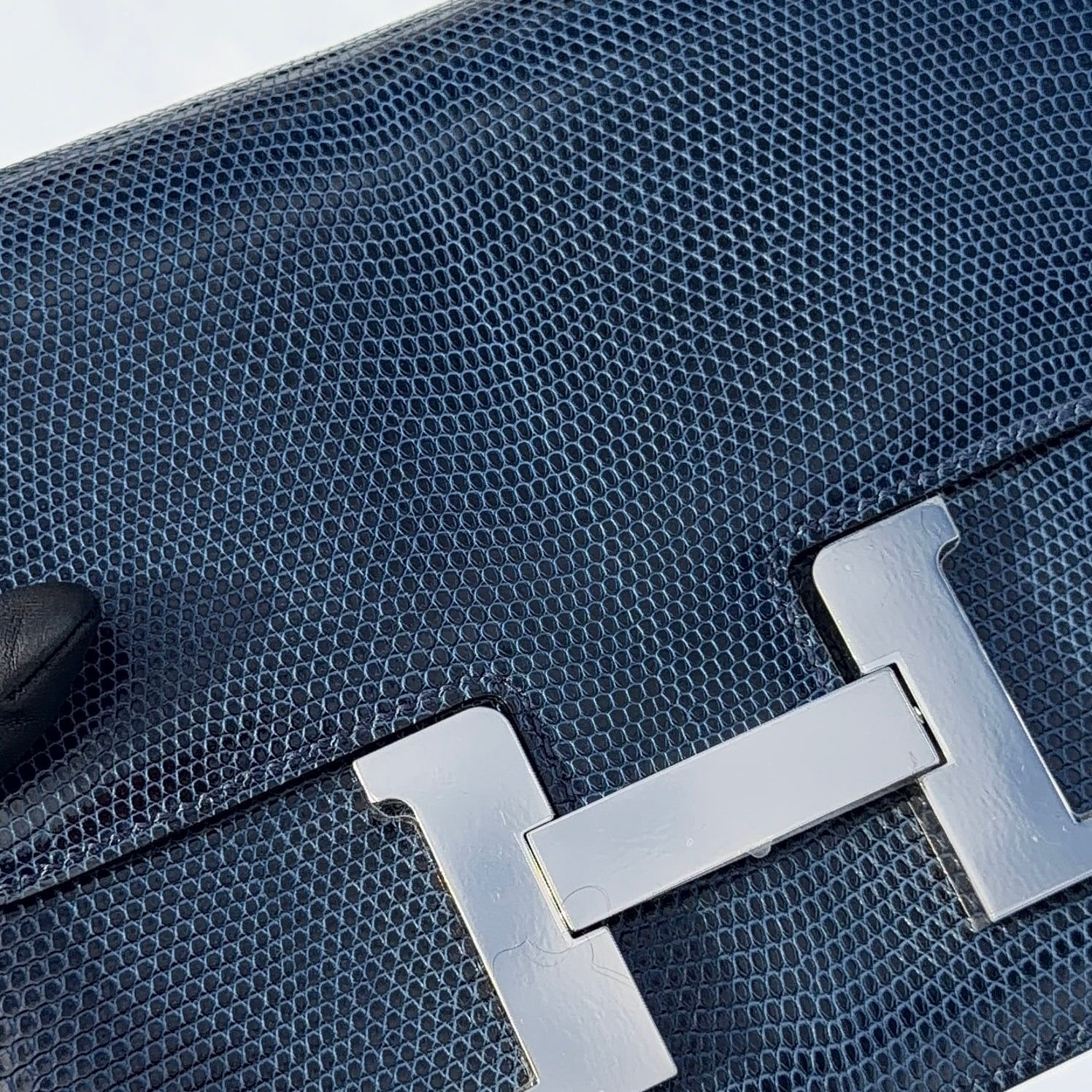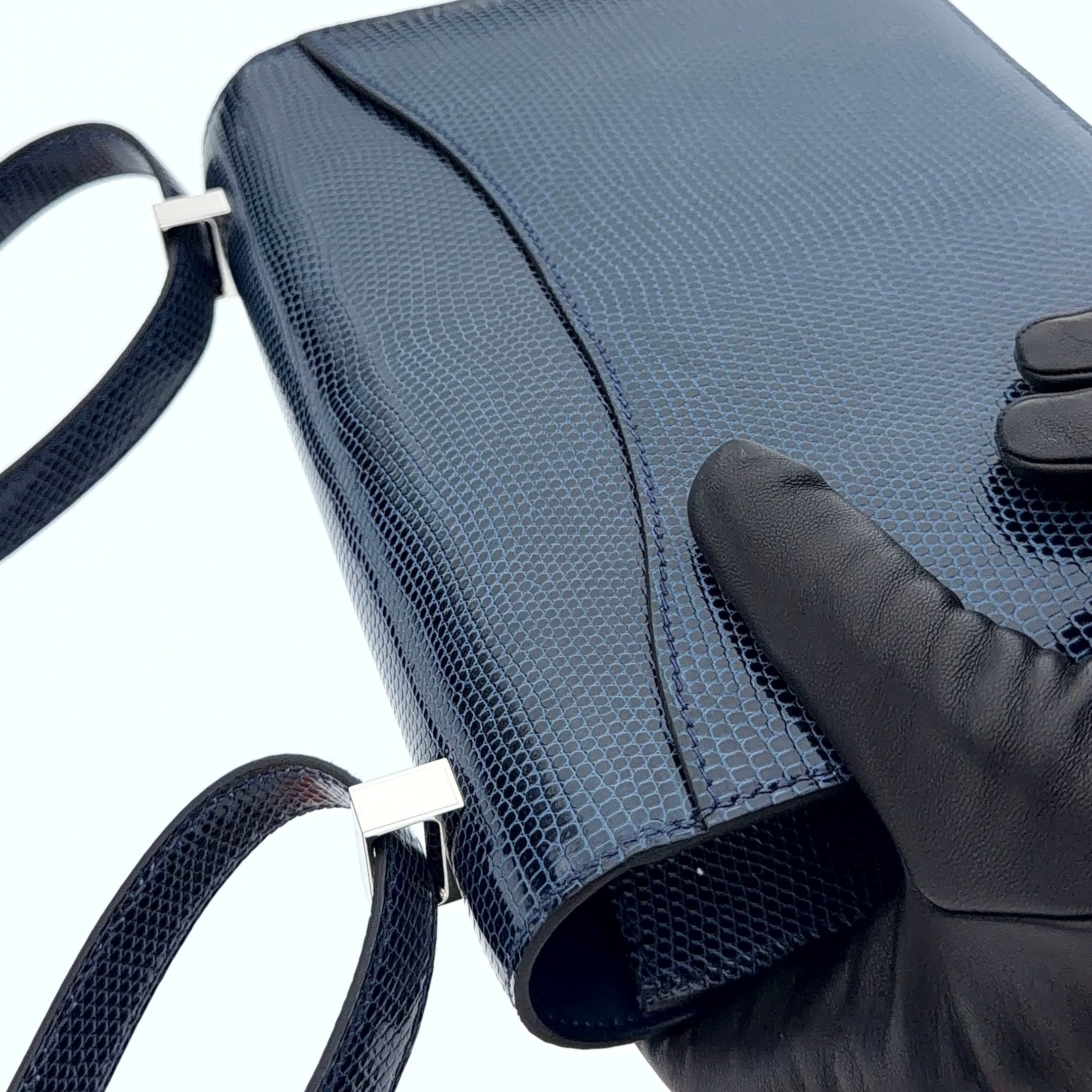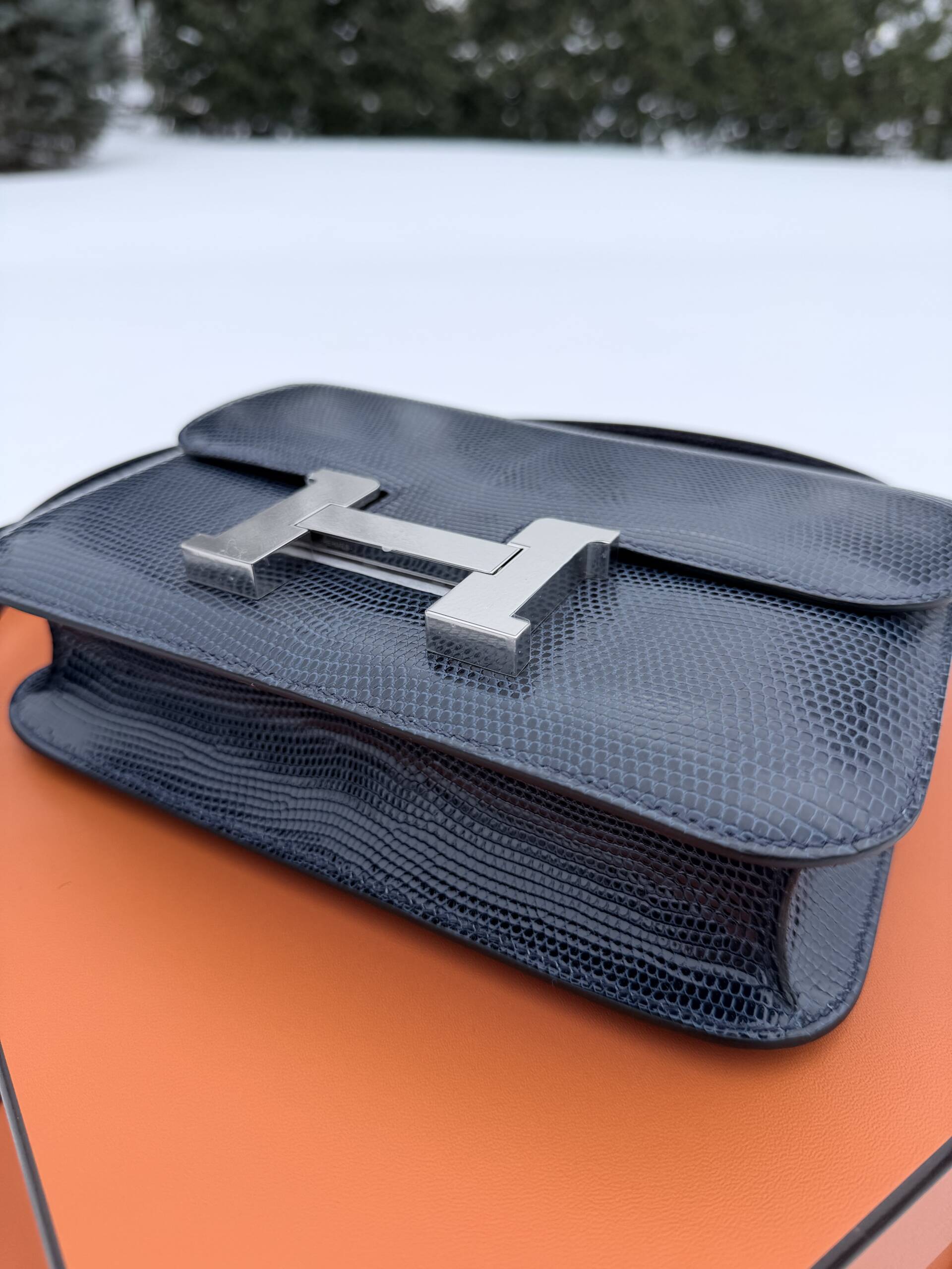 I mean who refuses anything lizard. Not me, but I was a bit concerned about where color conversation was headed. As the bag fully revealed itself from the felt, what I saw was the most exquisite lizard skin in a shade of blue that could be considered some sort of indigo, but with a unique hint, and I repeat just a hint, of maybe a steel gray. What was before my eyes was breathtaking, but yes, in a color I would have never considered previously, not even in a lizard. And now, the fact that the Constance she pulled out was in the newest released size of the 1–24, and not a C18, made it even more exciting as the bag exudes a casual vibe. Perfect for my new “blue jean era.”