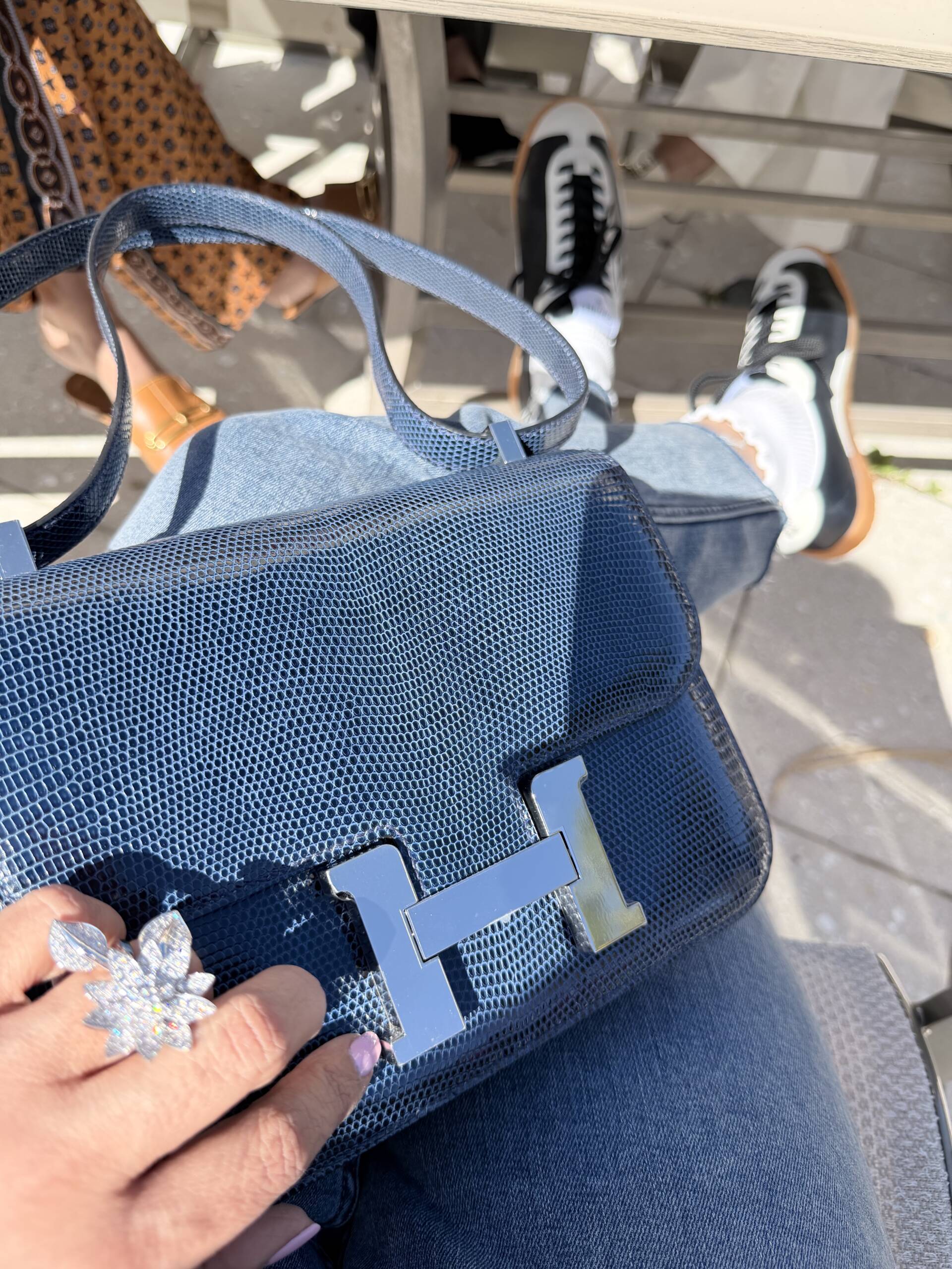 This new lizard 🦎 treasure was waiting in queue somewhere deep at the back of “the vault” for its debut (by now you know some reveals wait till it feels just right). It finally happened last week while headed to Florida for a girls trip to Naples, followed by a sisters reunion in Miami, where incidentally my daily uniform was going to be blue jeans, white T-shirts or a black long sleeve Skims body suit, an array of sneakers (yes, including the new current Chanel season bowling ball inspired ones), and a Hermès bomber or two. Yup, that’s the current vibe you’ll find me in most days, and what better than a Constance 1-24 in polished Niloticus Lizard in a color rarely seen — Blue de Malte (7L).