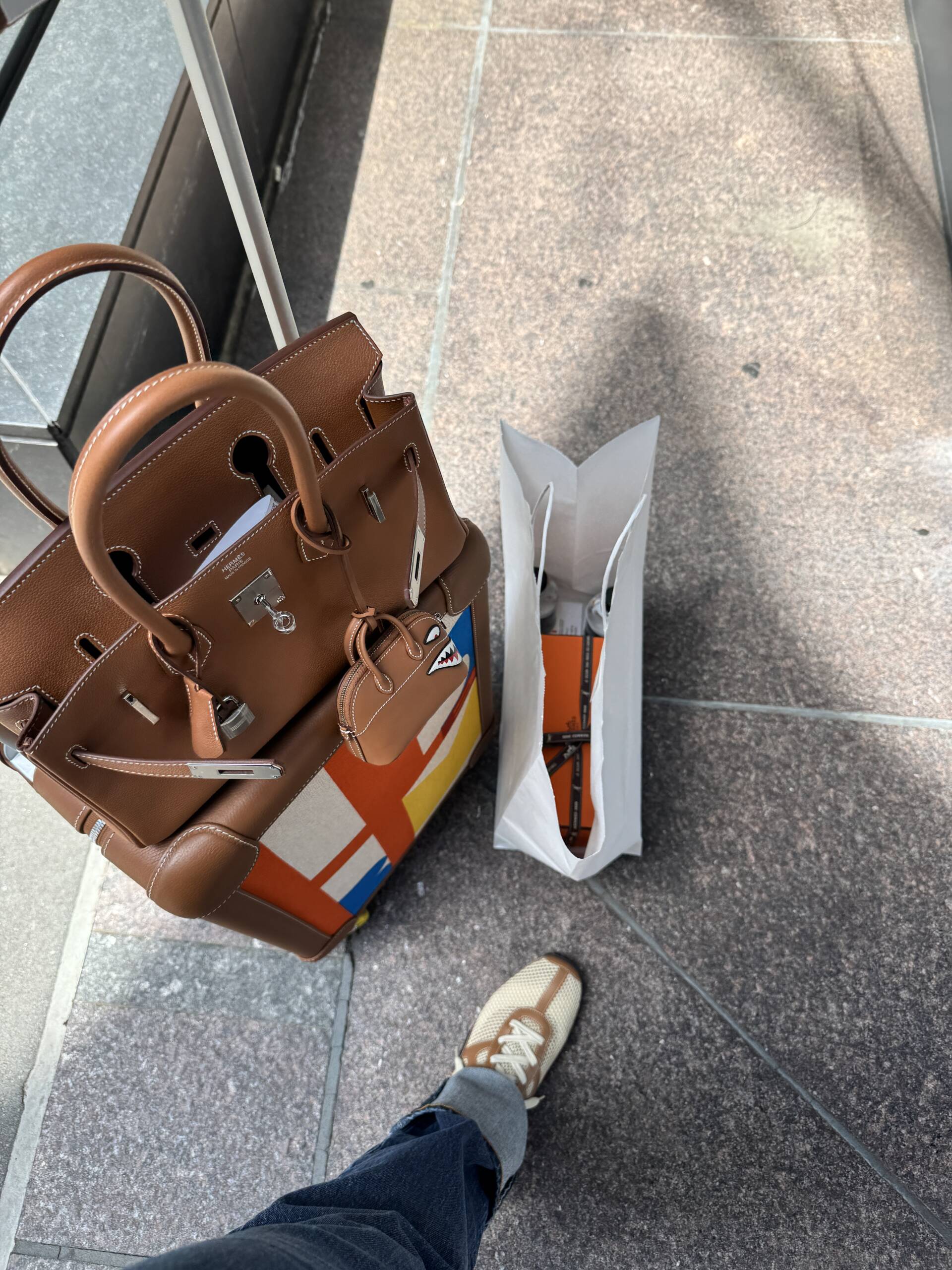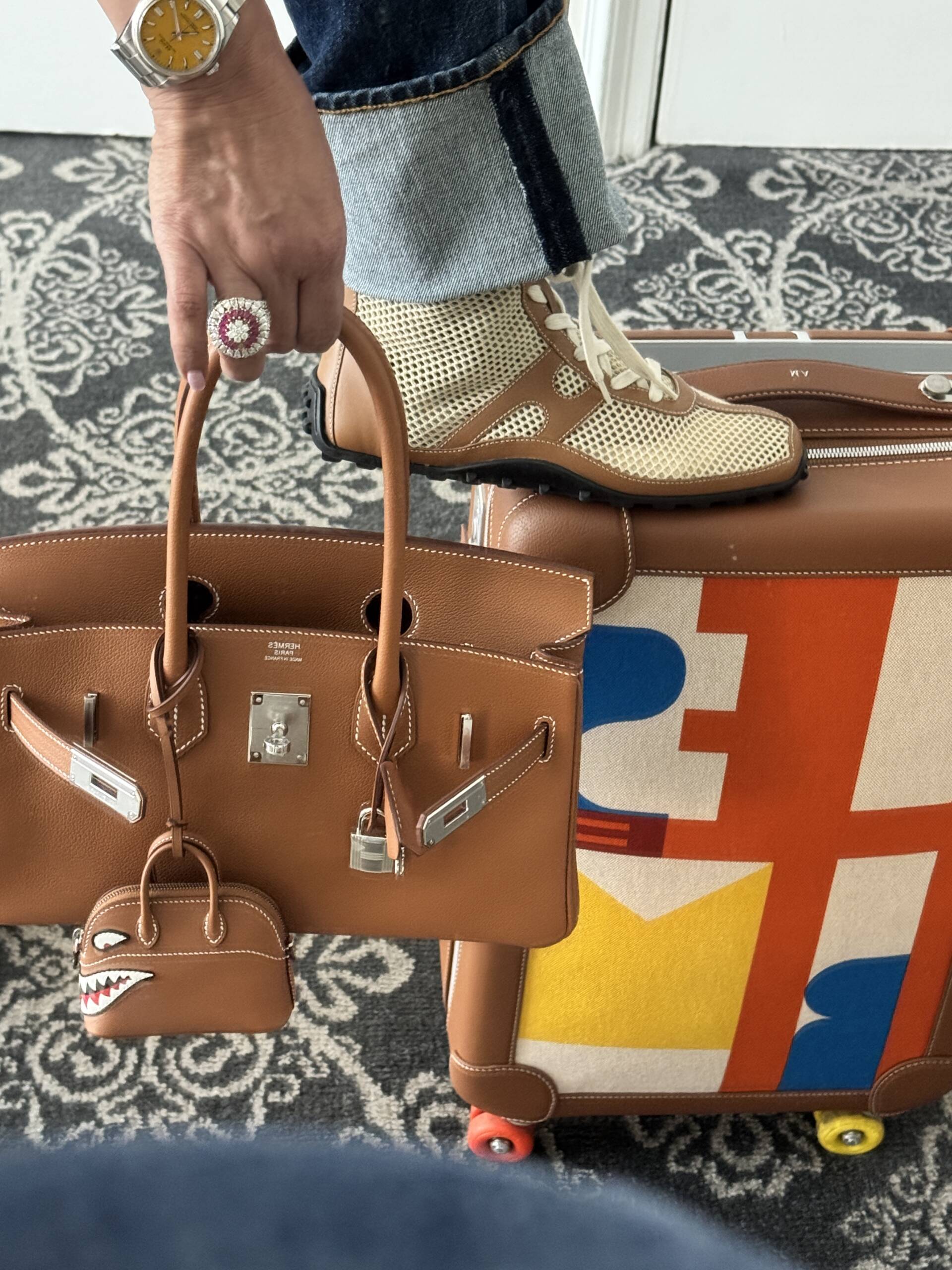 Hermès luggage with shoulder Birkin in Gold Evercolor with matching sneakers and shark charm.